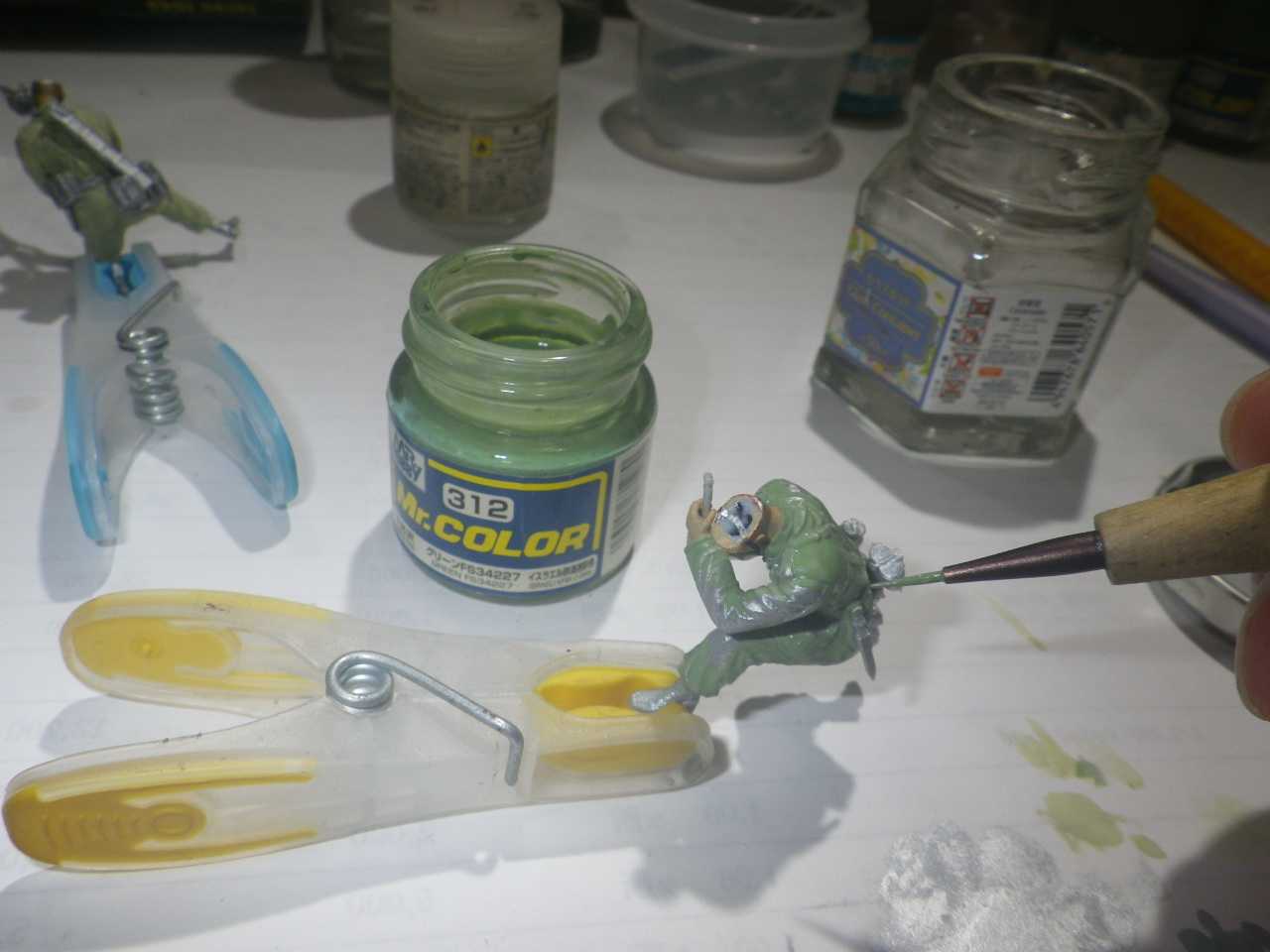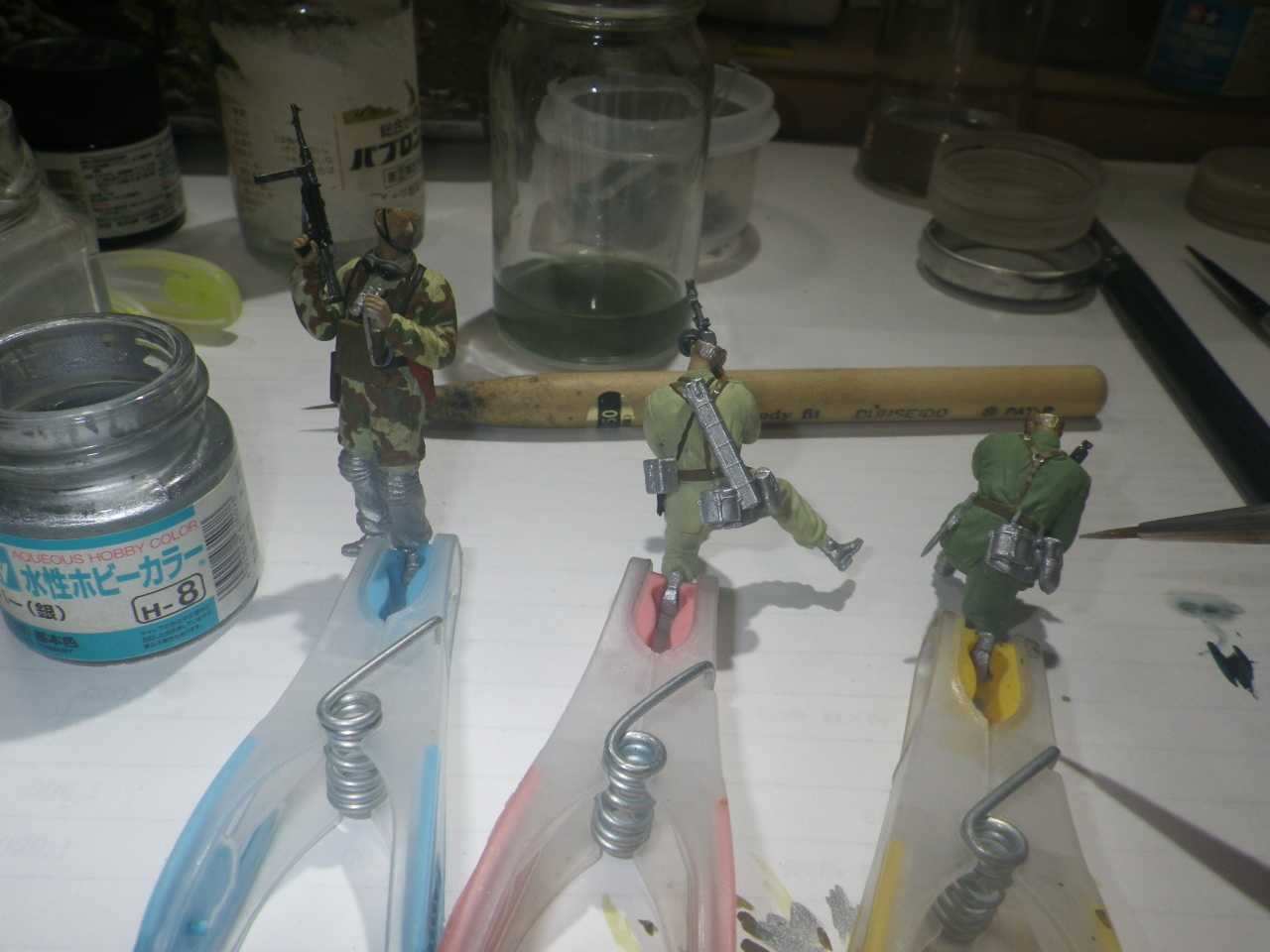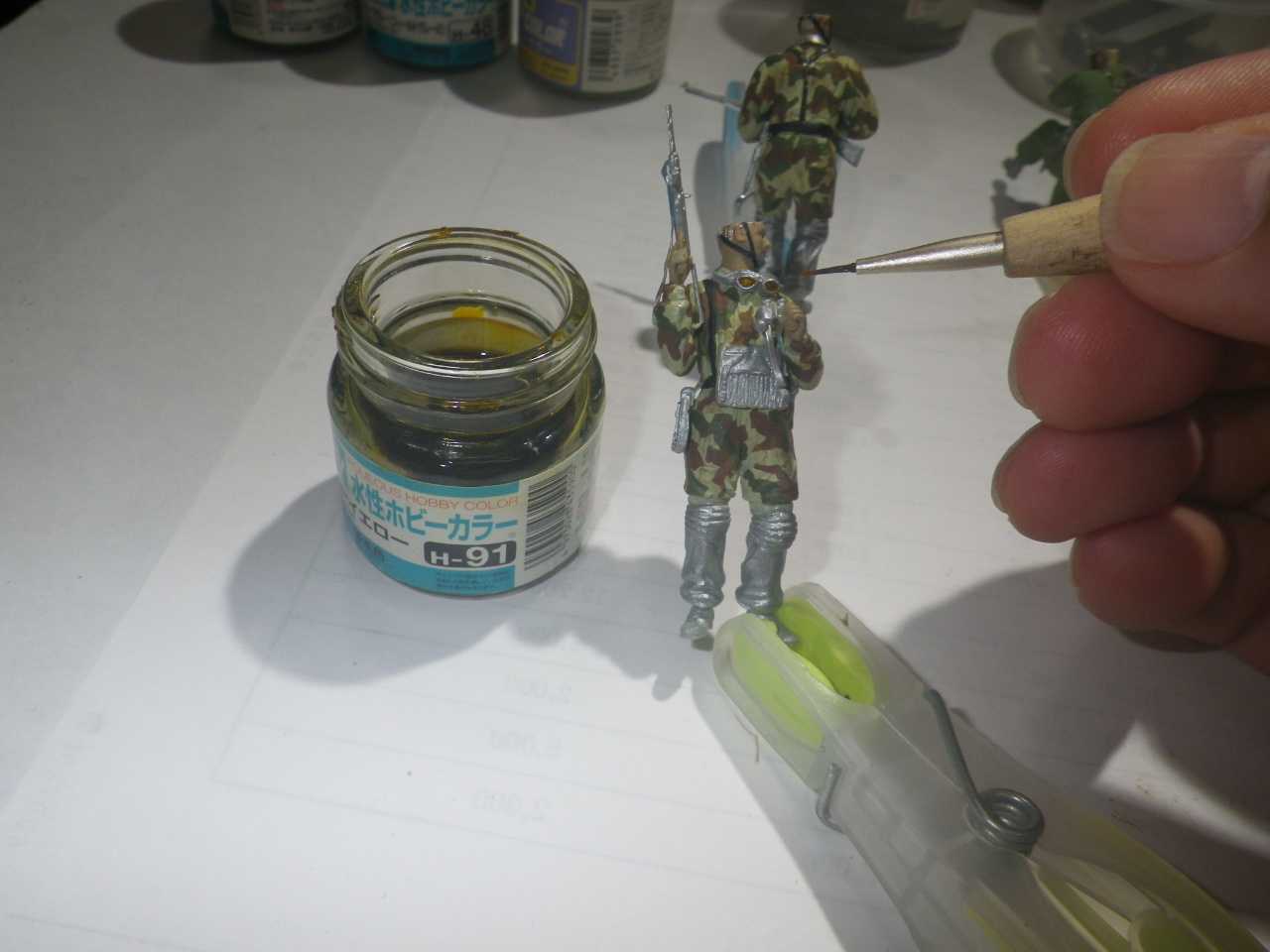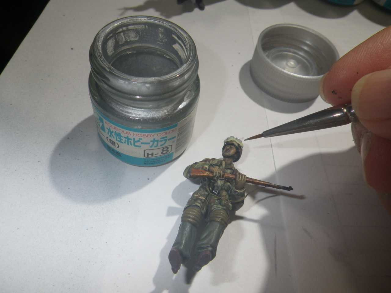 水性ホビーカラー H48 オリーブグレーで降下兵のズボンを塗ります水性ホビーカラー H47 レッドブラウンでジャンプブーツを塗ります近接こんな感じです