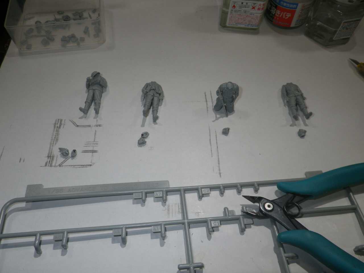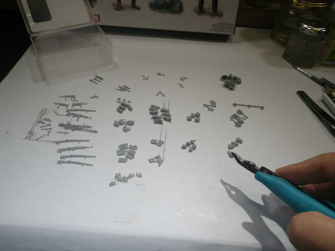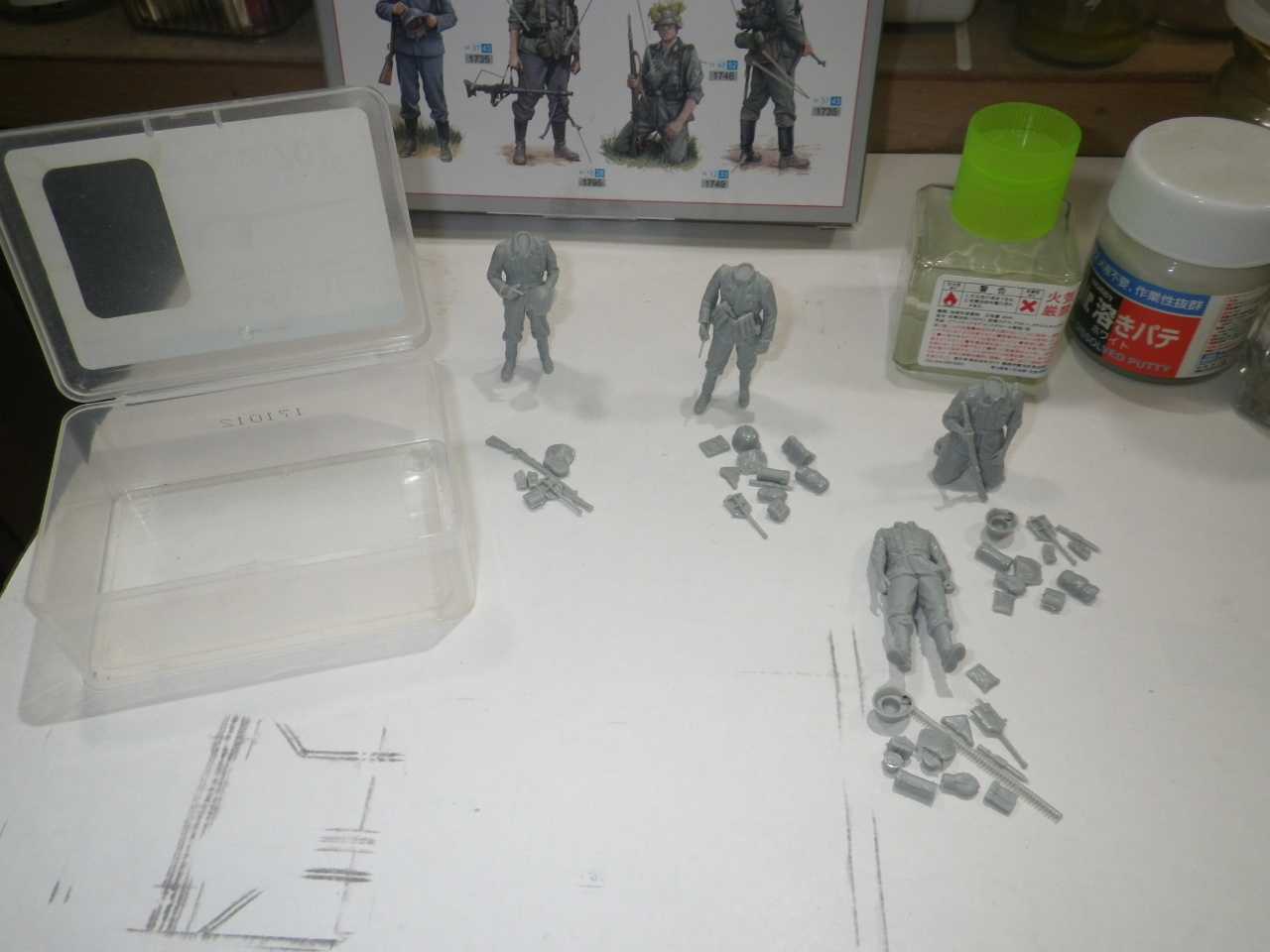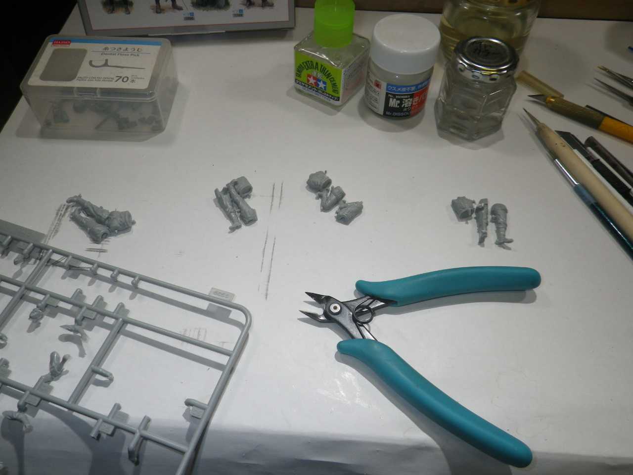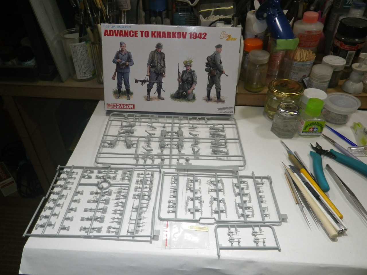 今回は本商品の製作を始めます独ソ戦の激戦地のひとつがソビエト第3の都市として知られるハリコフで、この都市を巡るソビエトとドイツの攻防戦は1941年から43年にかけて4回にわたって戦闘を繰り広げられたそうです1942年、ハリコフを奪還しようとするソビエト軍からこれを防衛した第6軍のドイツ軍兵士の姿だそうです3体がドイツ国防軍兵士を、1体はドイツ空軍の地上部隊兵士です国防軍兵士は標準的な野戦服に身を包み、2体はヘルメット、1体は略帽を被った状態です空軍兵士はポケットのデザインなどに特徴がある野戦服を着用、足元はブーツ、頭には略帽を被った姿です水筒や飯盒、ガスマスクケースやブレッドバッグ、弾薬ポーチなどの個人装備やKar98K、MP40、MG34などの火器類はGen2別パーツが同梱されています先ずは装備品の先行加工から始めます切り離し前に細かい部品はランナー付きの状態で継目切削処理します切り離して別容器に集積します兵士のランナーの装備品も同様に先行処理します