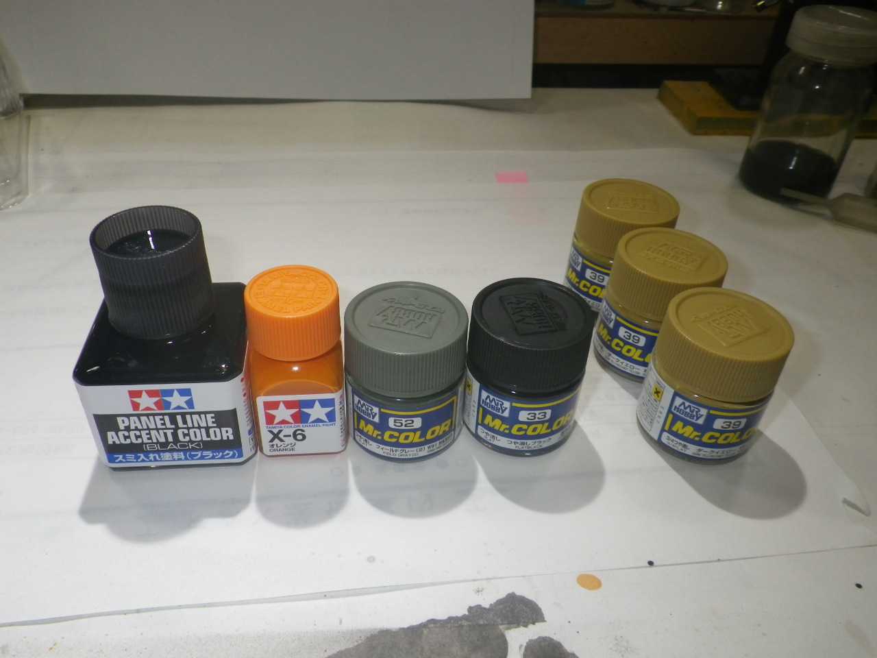 4月の新規購入品 2回目 塗料類ですMr.カラー C39 ダークイエロー (サンディイエロー)3本です使用頻度の高い色なので複数本を大人買いしましたMr.カラー C33 つや消しブラックMr.カラー C52 フィールドグレー (2)ですタミヤ スミ入れ塗料 (ブラック) タミヤカラー X-6 オレンジです1/35の戦車類に塗装するにはメーカーの調色してくれている艶目の色調は塗り仕上げた時にはテカリを感じて不満足でしたこの色は完全艶消しの塗り上がりが自分の思う塗り上がりです墨入れ塗料で影落としを行うとこの墨入れ塗料の表面残留塗膜が若干の艶を発するように思います(特に兵士の服を仕上げた時の近接フラッシュ撮影で感じました)フラットベースは以前使用してみましたが完全艶消しにするには1瓶容器の容量では(私の感覚では)不足気味に感じましたその上添加した塗料瓶の容量も液面が上がり撹拌しにくくなってしまう事も体験したため最近は採用していません代わりに炭酸マグネシウムを艶消し材として添加しますこの炭酸マグネシウムは40数年前に少年が薬局で工業用の500gを箱買いしたものをずっと保管していましたそれを小分け容器に所少量づつ移し替え、必要な時このように新規購入塗料に添加、使用中のテカリの加減で更に添加を行い自分が満足する艶消しの塗り上がりを目指しています添加したらすぐに塗装に使用しないので蓋を閉めてしまいます添加材は時間はかかりますが瓶内に沈降します塗装前に撹拌するのでその時に全体に混ざるのでこの時点では何もせず封印します添加した塗料瓶には識別のための+Mgをマーキングします他の色も同様に行います唯一C-33艶消しブラックはメーカー調色のままで使用しますこのMrカラーの艶消しブラックの艶感は私は気に入っています艶消しとありながらも塗り上がりはしっとり艶感のある艶消し黒に仕上がります兵士のベルト・ブーツ等皮革類の黒色、タイヤ等車両系のゴム部品の新規色にはこの艶目に大変満足していますその色目で仕上げ塗りした上にホコリ薄汚れを墨入れ塗料グレイや蚊取り線香灰ペースト塗りで退色表現をしますこの事は40数年前のレベルカラー時代にも感じていた感覚です同様に識別マーキングを入れて保管容器に移します