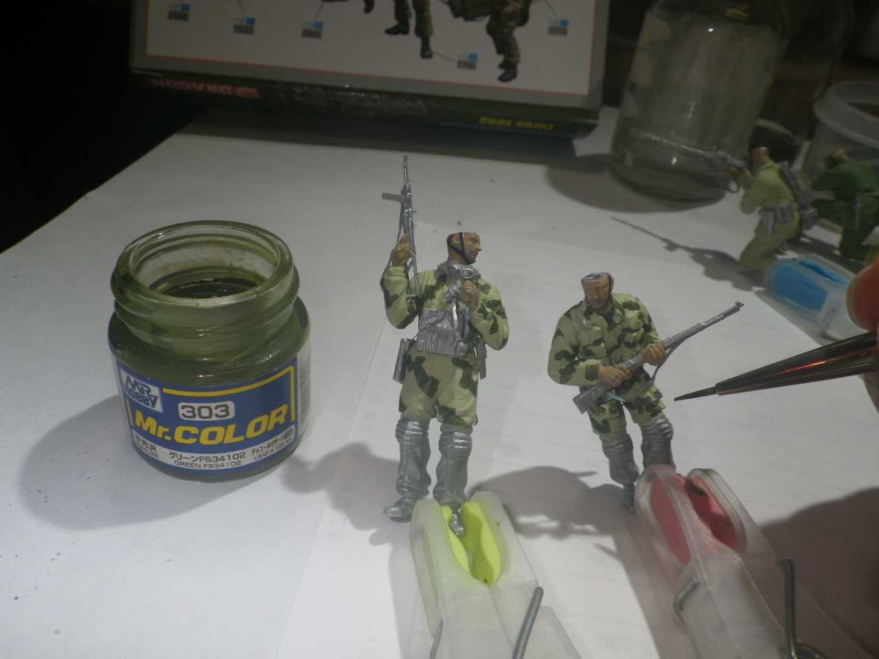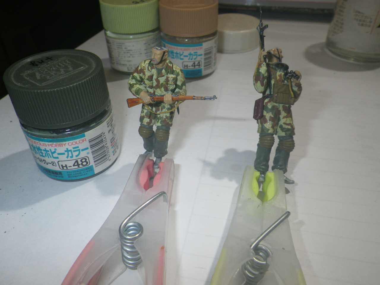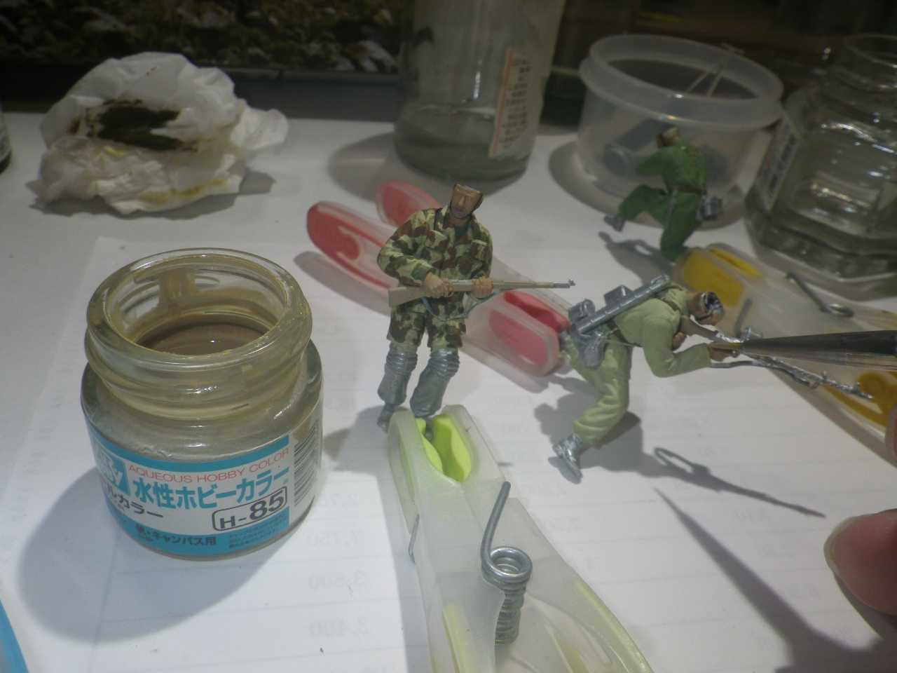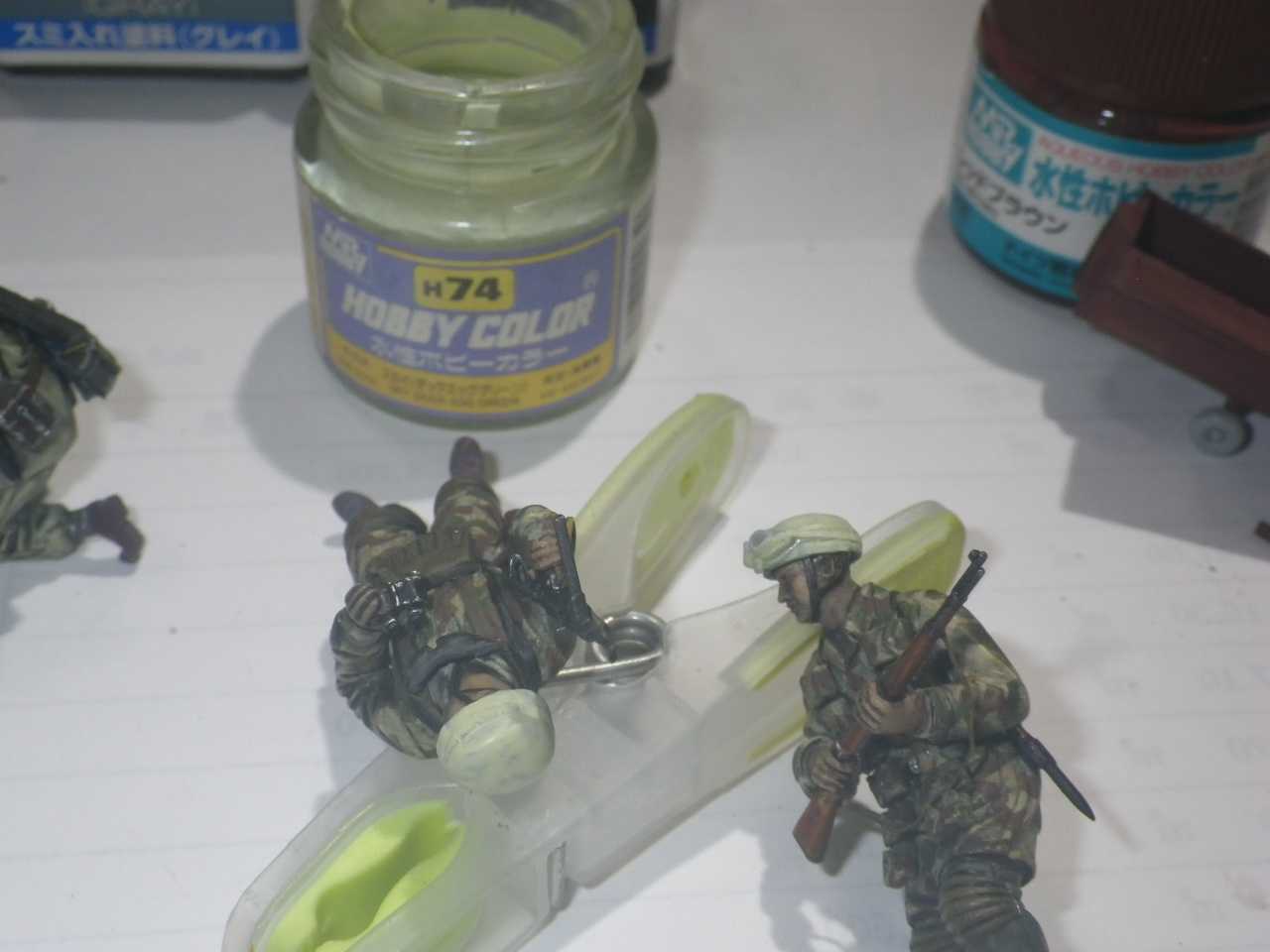 降下兵2名の迷彩カバー塗装をします水性ホビーカラー H74 スカイで下地塗りします水性ホビーカラー H60 濃緑色 (暗緑色) (2) で緑系迷彩を入れます水性ホビーカラー H37 ウッドブラウンで茶系迷彩を入れます水性ホビーカラー H47 レッドブラウンでウォーターパターンをカスレ塗りします近接こんな感じです水性ホビーカラー H81 カーキでバンドを塗ります近接こんな感じです