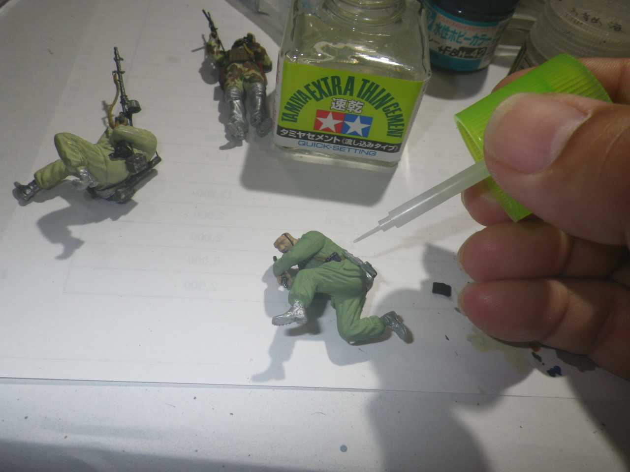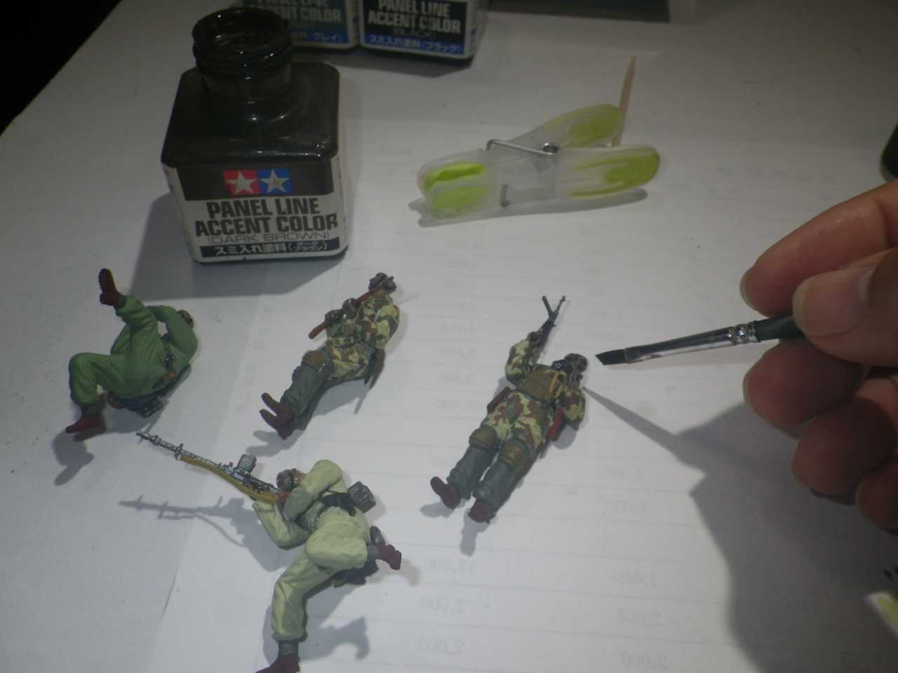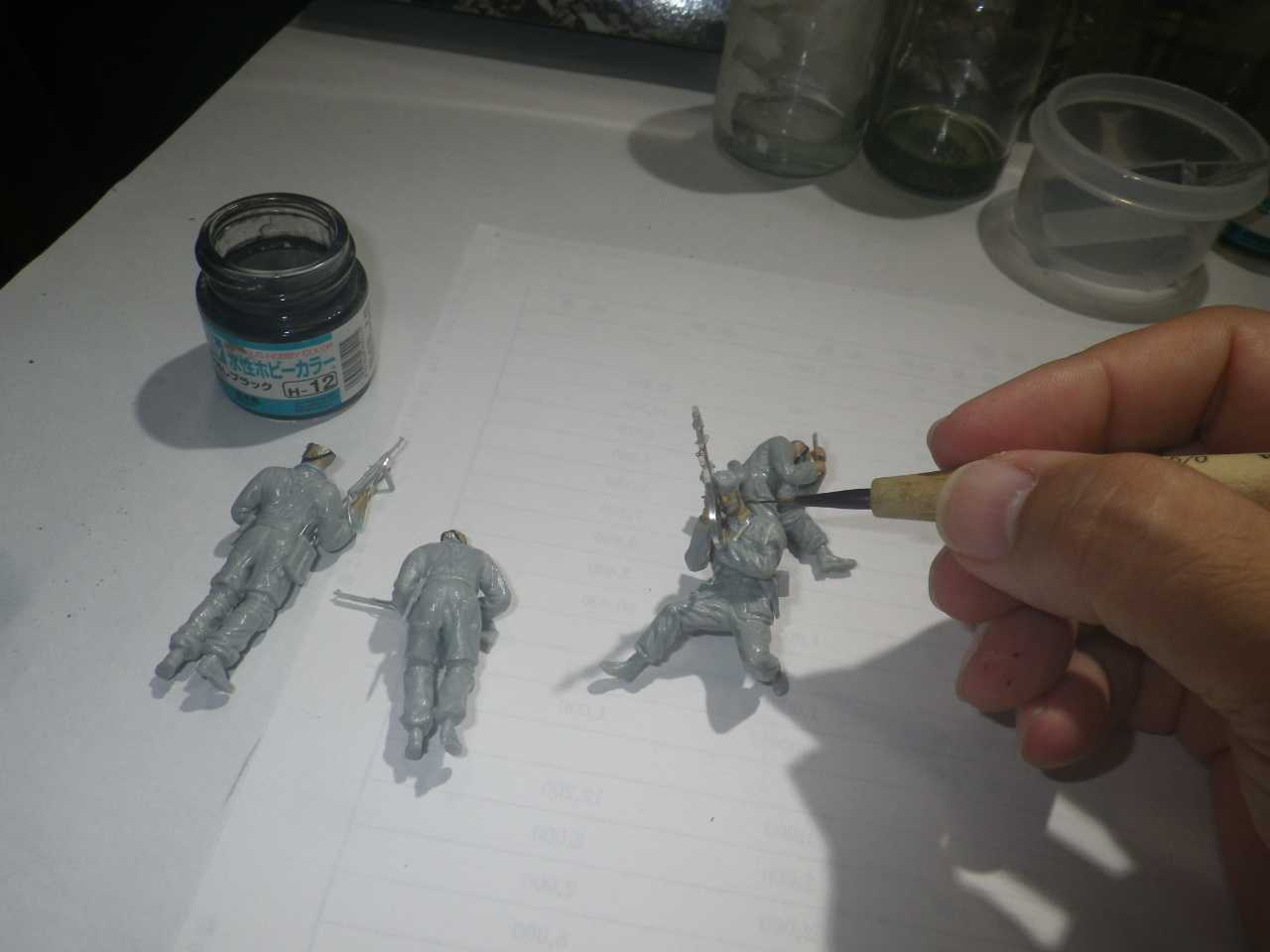 タミヤ スミ入れ塗料 ブラックで服の影落としをしますまず上着を全塗りします余剰塗料除去します次にズボンの影落としをします余剰塗料除去します近接こんな感じです今度は機関銃兵二人を影落としします余剰塗料除去します近接こんな感じです