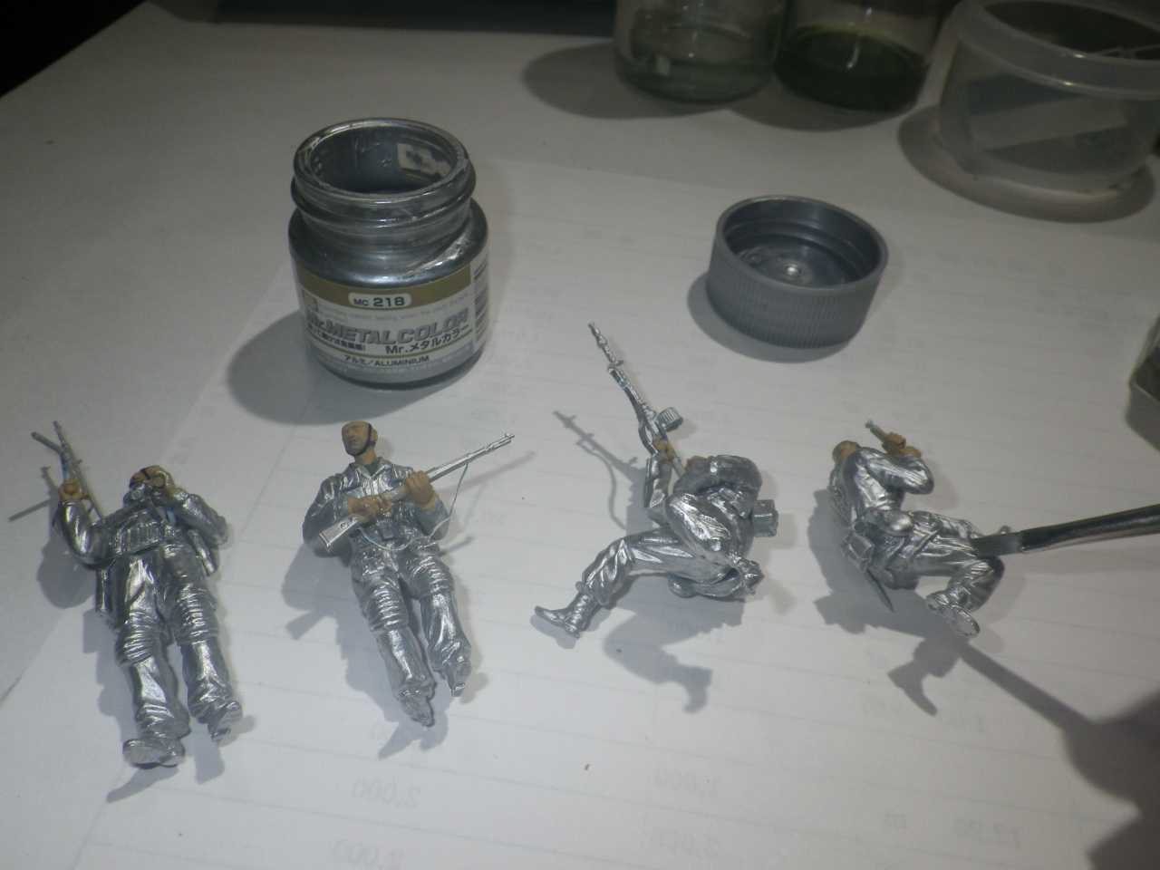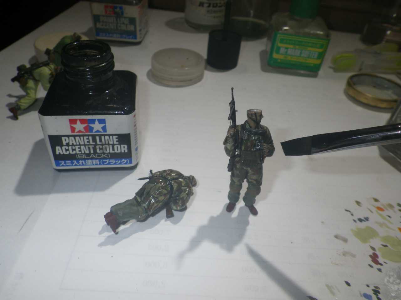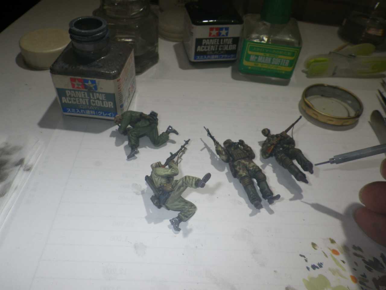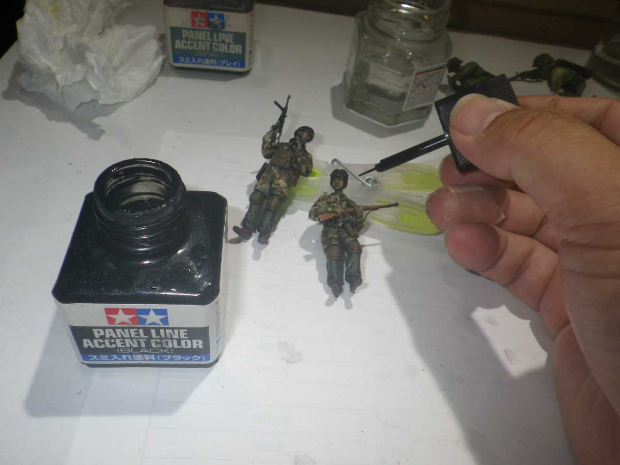 タミヤ スミ入れ塗料 ブラックで服の影落としをしますまず上着を全塗りします余剰塗料除去します次にズボンの影落としをします余剰塗料除去します近接こんな感じです今度は機関銃兵二人を影落としします余剰塗料除去します近接こんな感じです