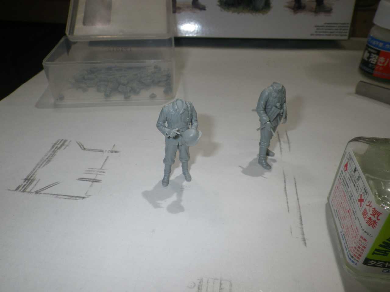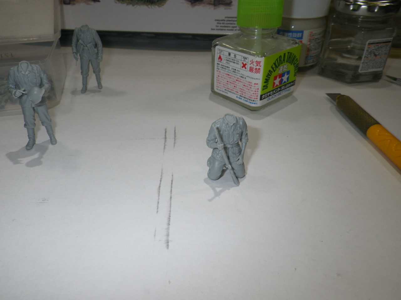 頭部を切り出しますゲートを切除して段差継ぎ目を削ぎ切りして継目切削と顎ライン加工、耳の成形加工します頭髪ラインをスジボリします各兵士に取り付けます近接こんな感じです