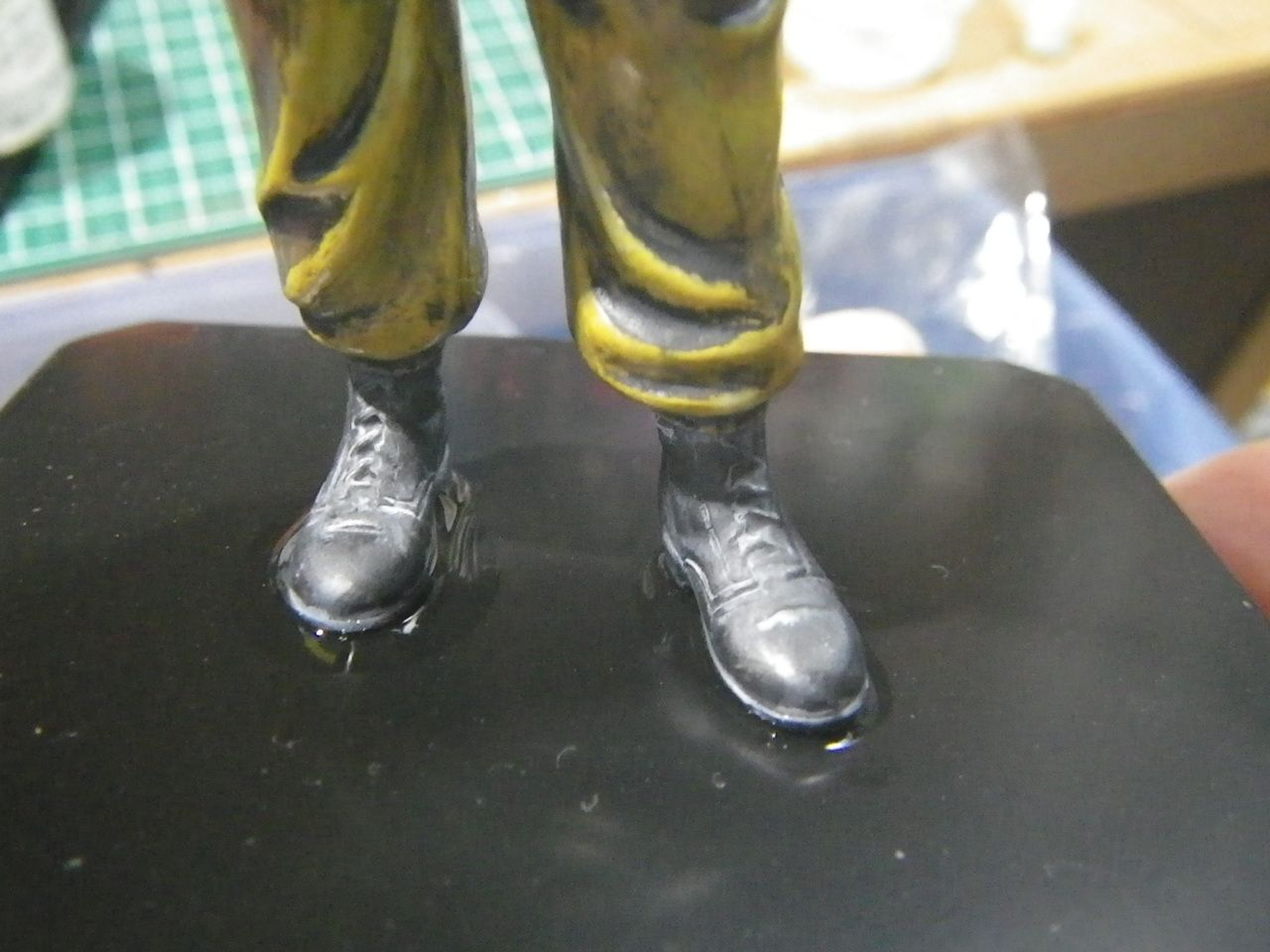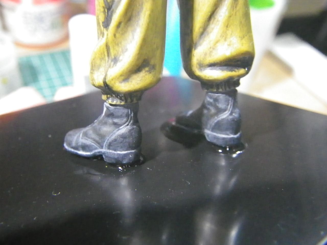 本作品では降下猟兵用の編み上げブーツを黒皮製のイメージで塗装したので墨入れ塗料(グレイ)を全体塗りしてウォッシング仕上げとしました