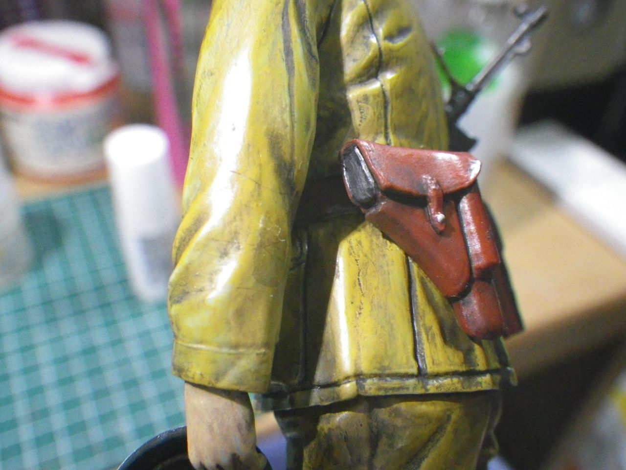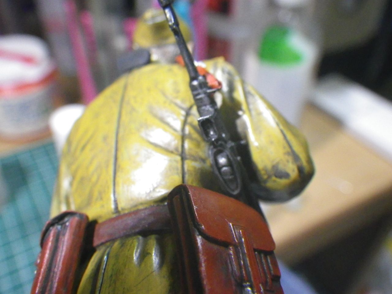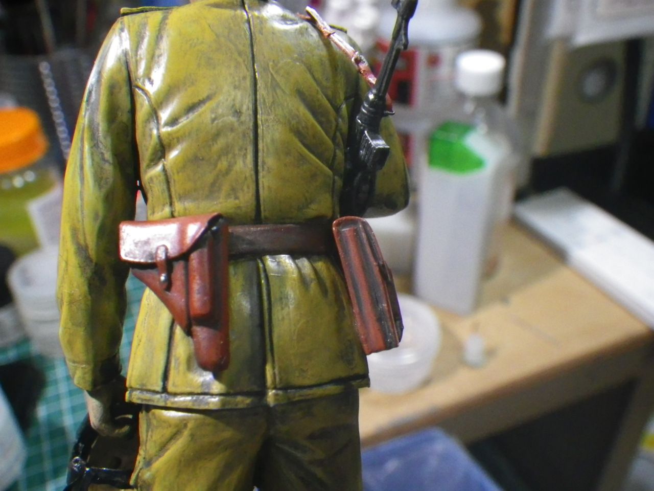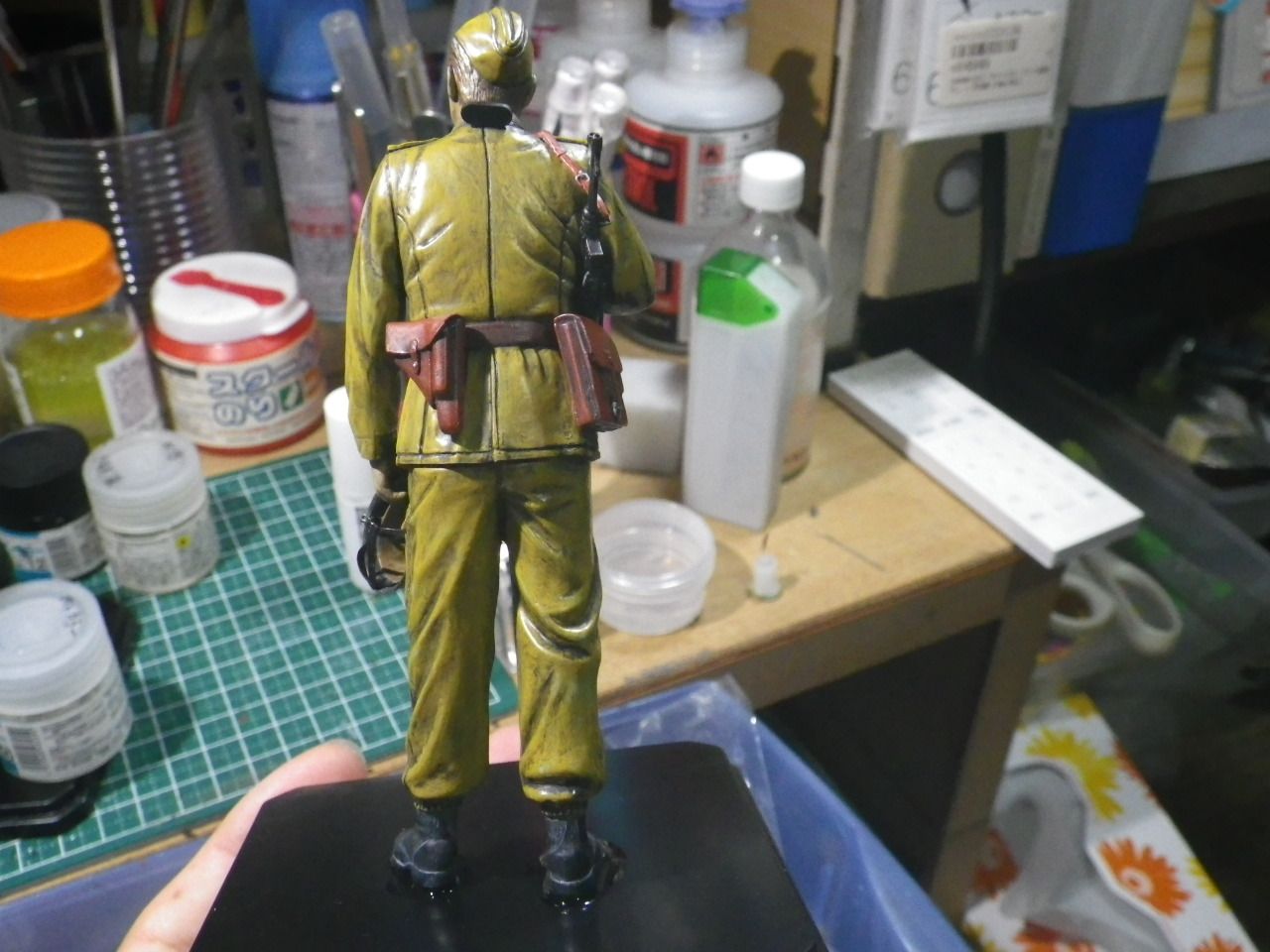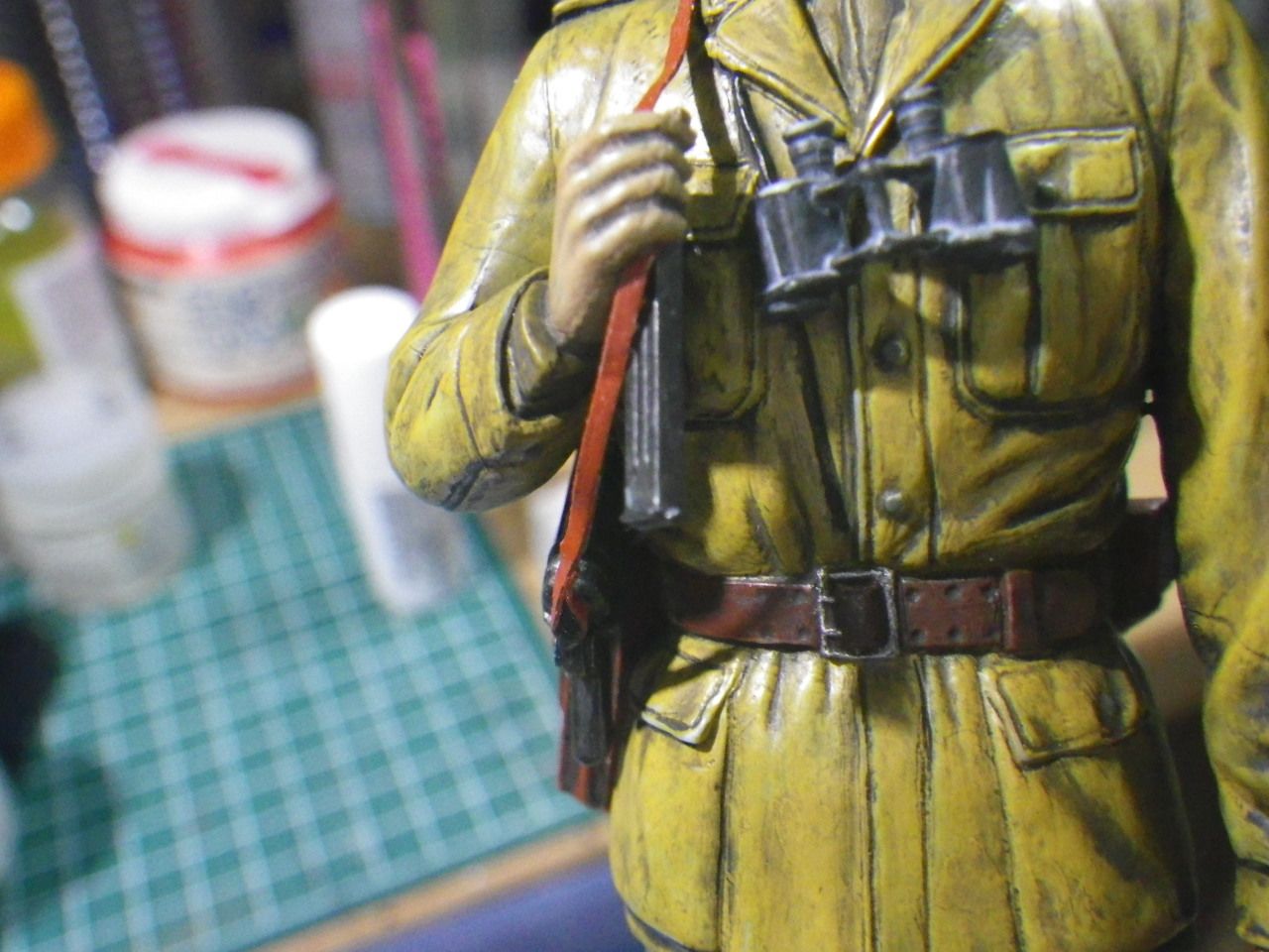 服のボタンは銀色で塗装後薄めのフィールドグレーを乗せ下地の銀を透けさせ墨入れ塗料(ブラック)を直接塗りして金属の褪せ具合を表現してみました。