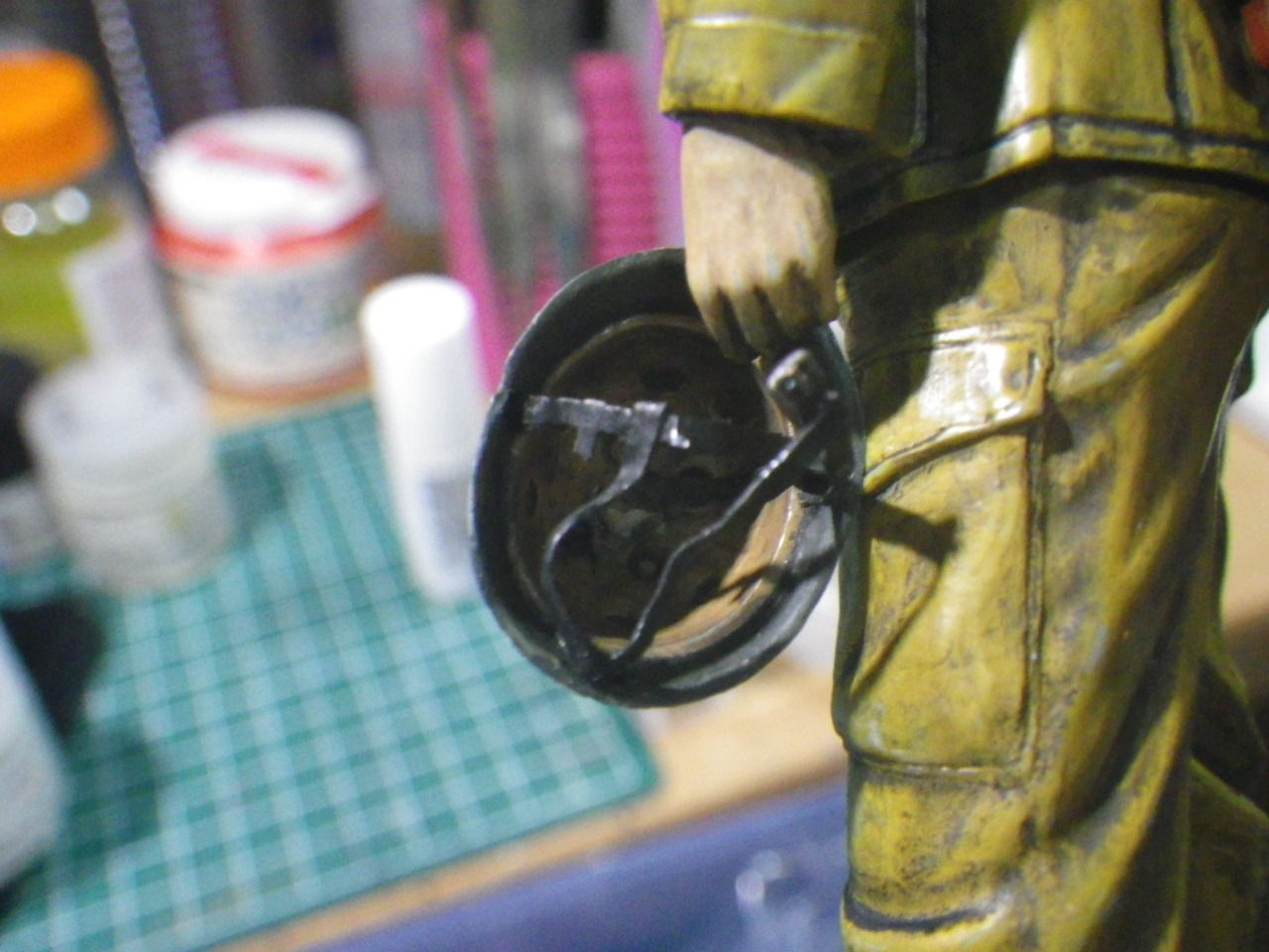 ネットで降下猟兵用の実物ヘルメットを閲覧してそれらしく瞬間接着剤で貼り付け、塗装完了後ヘルメットに押し込みました