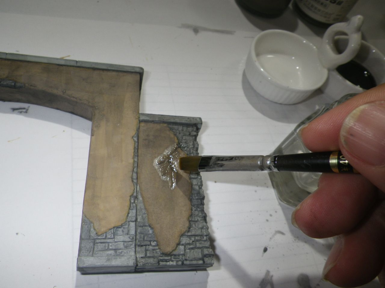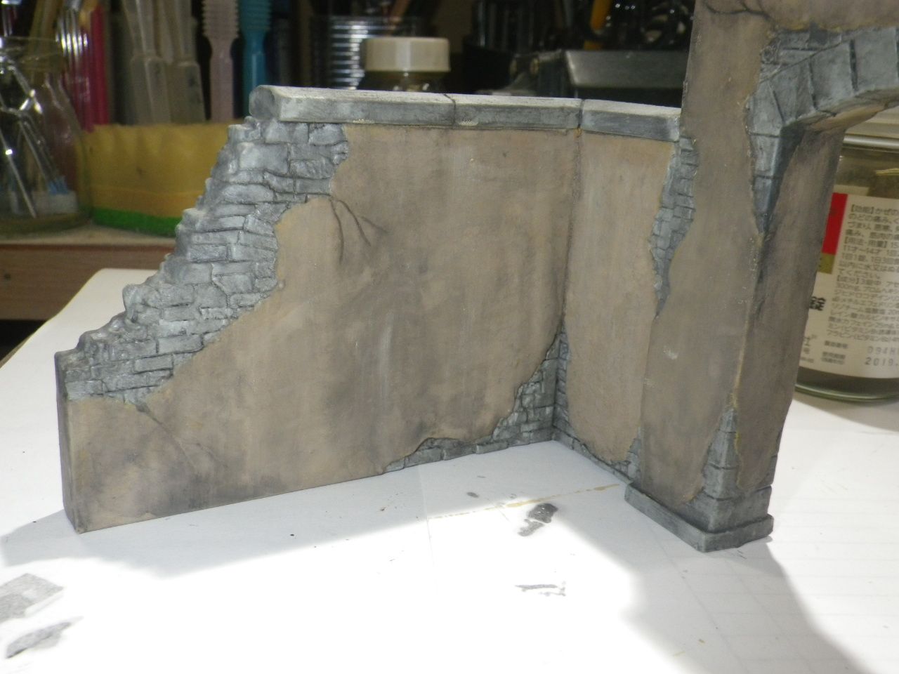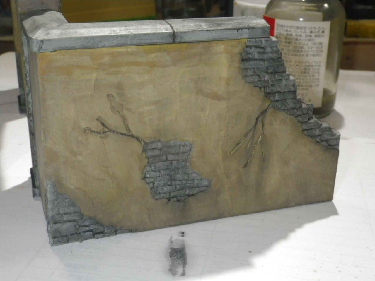 撮影を忘れて作業が進んでしまいましたが全体を墨入れブラックを希釈させた塗料でで全体を覆っています。表面がざらついているので塗布顔料は吸い込まれます、余剰塗料除去はできません。