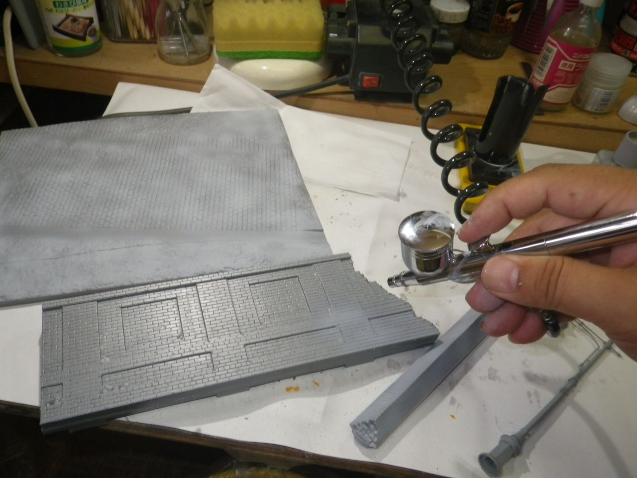 張り合せ部材の継目具合を確認する意味も含めてサーフェイサーを吹付けします。