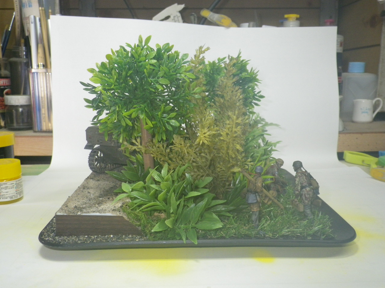 このジオラマは草むらを挟んだ段差地面となっていて両面から眺めるジオラマになっています