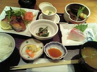 おはな?で食べました。客先から戻ってくる途中に。1050円です。都鳥の仙台味噌漬け焼き(レタスとトマトときゅうりがそえてある)、イカ大根(蕪と水菜がそえてある)、カンパチがメインです。茶碗蒸しとおひたし(ほうれんそうとじゃこだったか・・・?)もついてます。 味噌汁も仙台味噌かな。 その他にソフトドリンク(コーヒー)とデザートがつきます。これだけついて1050円だと、ちょっとお得な気がします。味はちょっと濃い目ですが、またいってもいいかなと思いました。おまけ・・?↓