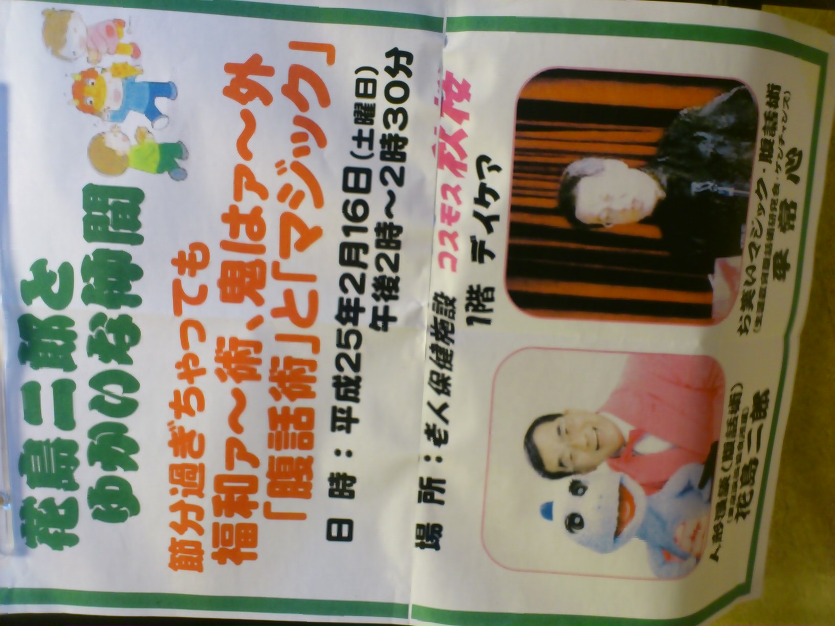 2月2日に、花島二郎さんと茨城県の阿見にある特別擁護老人ホーム「阿見翔裕園」に行って来た。2月4日は、土浦の常陸学院幼稚園へ、今回で10回目で10年目ほとんど腹話術の練習をしていなかったので、最悪。反省ばかりでした。