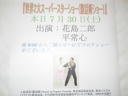 http://members.jcom.home.ne.jp/jva/7月20日(土)13:00~公推協子どもスマイル助成「実践こども腹話術」同時開催:被災地支援チャリティ公演ドラマin腹話術日時:7月20日(土)開演:午後1時30分会場:成美教育文化会館グリーンホールチャリティチケット 大人1000円、子ども100円主催:NPO法人日本腹話術師協会共催:腹話術愛好者の会・東京チャターズ私は、別件で、長野県上田で腹話術のオファーが7月20日(土)に有りますので残念ながら観にいけません。うさぴょんさんへ > 下記アドレスへメールで住所お知らせいただければチラシとチケット1枚送ります。hisusumu@Jcom.home.ne.jp現在、「芝浜」研究中です。