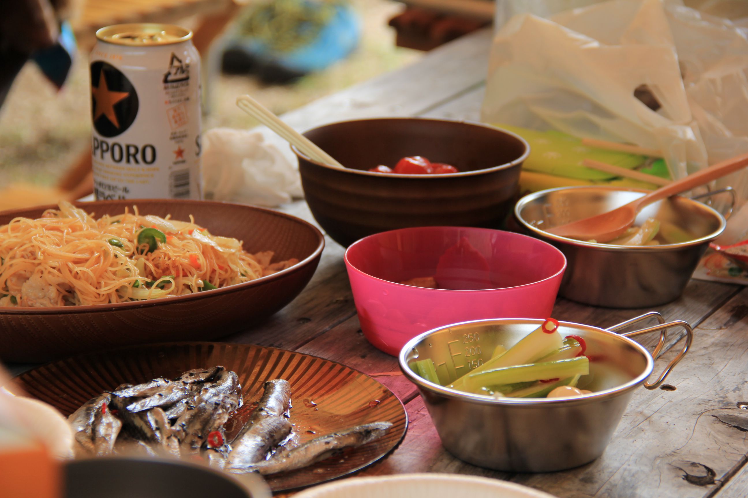 持ち寄ったりその場で作ってくれたお料理が並んで