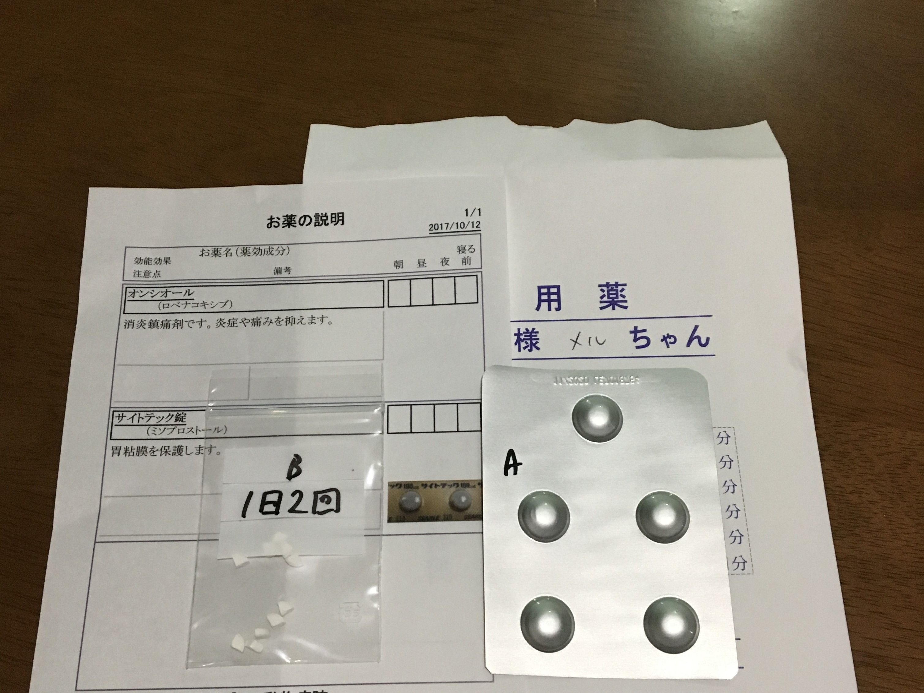 消炎鎮痛剤と副作用の下痢を抑える薬をもらって、4日後にまた診てもらうことに。
