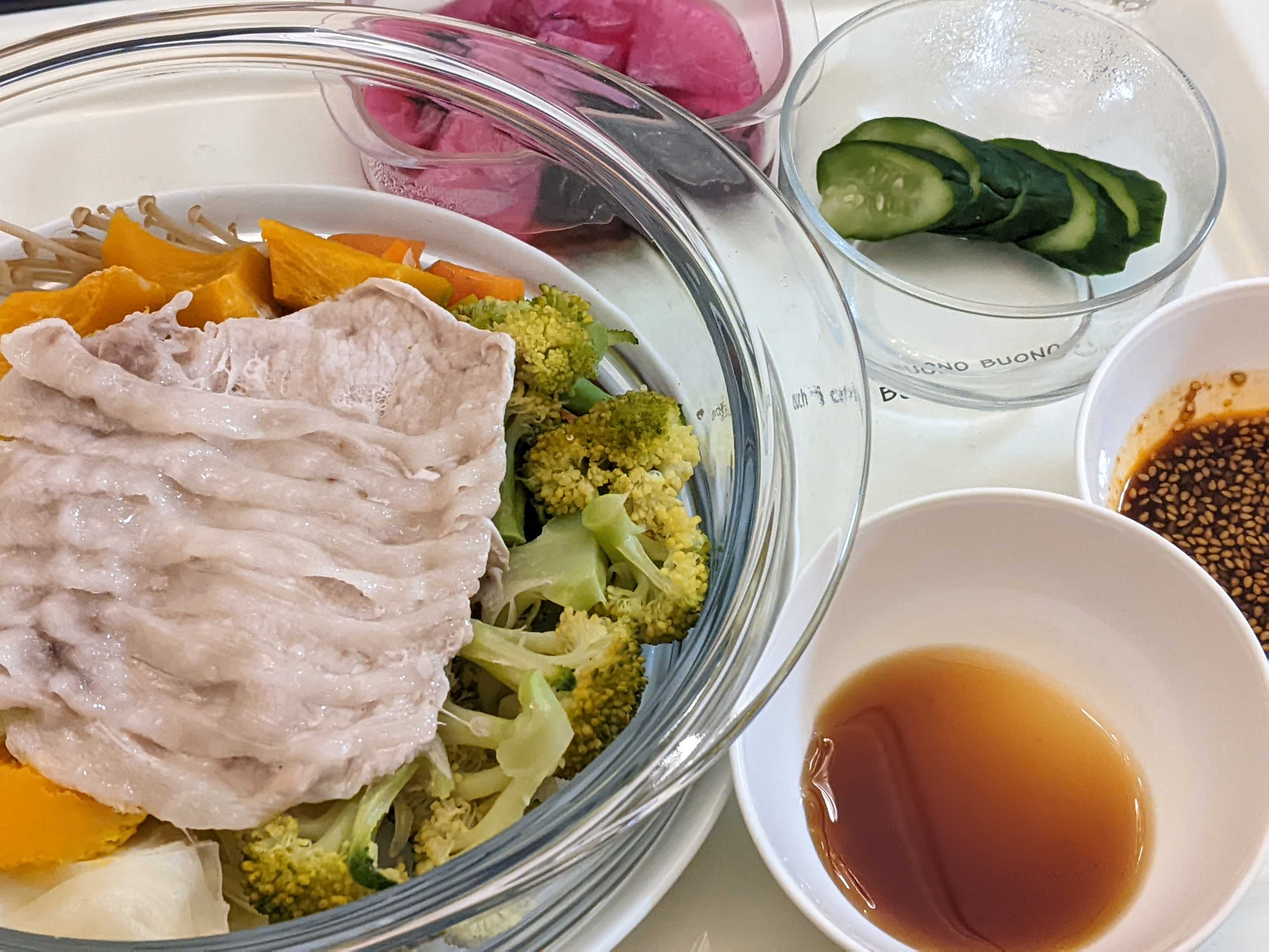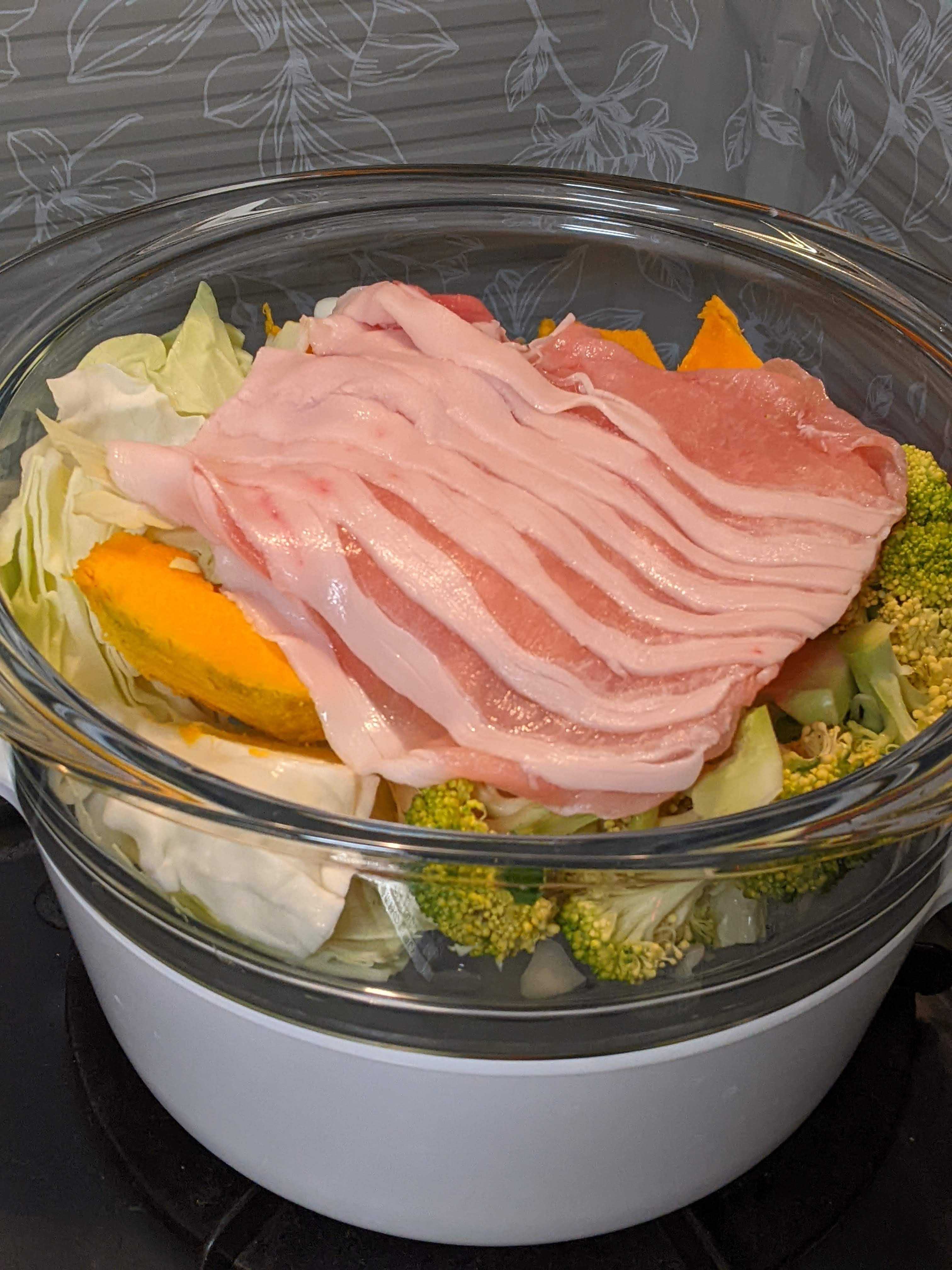 あ。タンパク質!ってところで冷凍庫にあった豚肉を投入!
