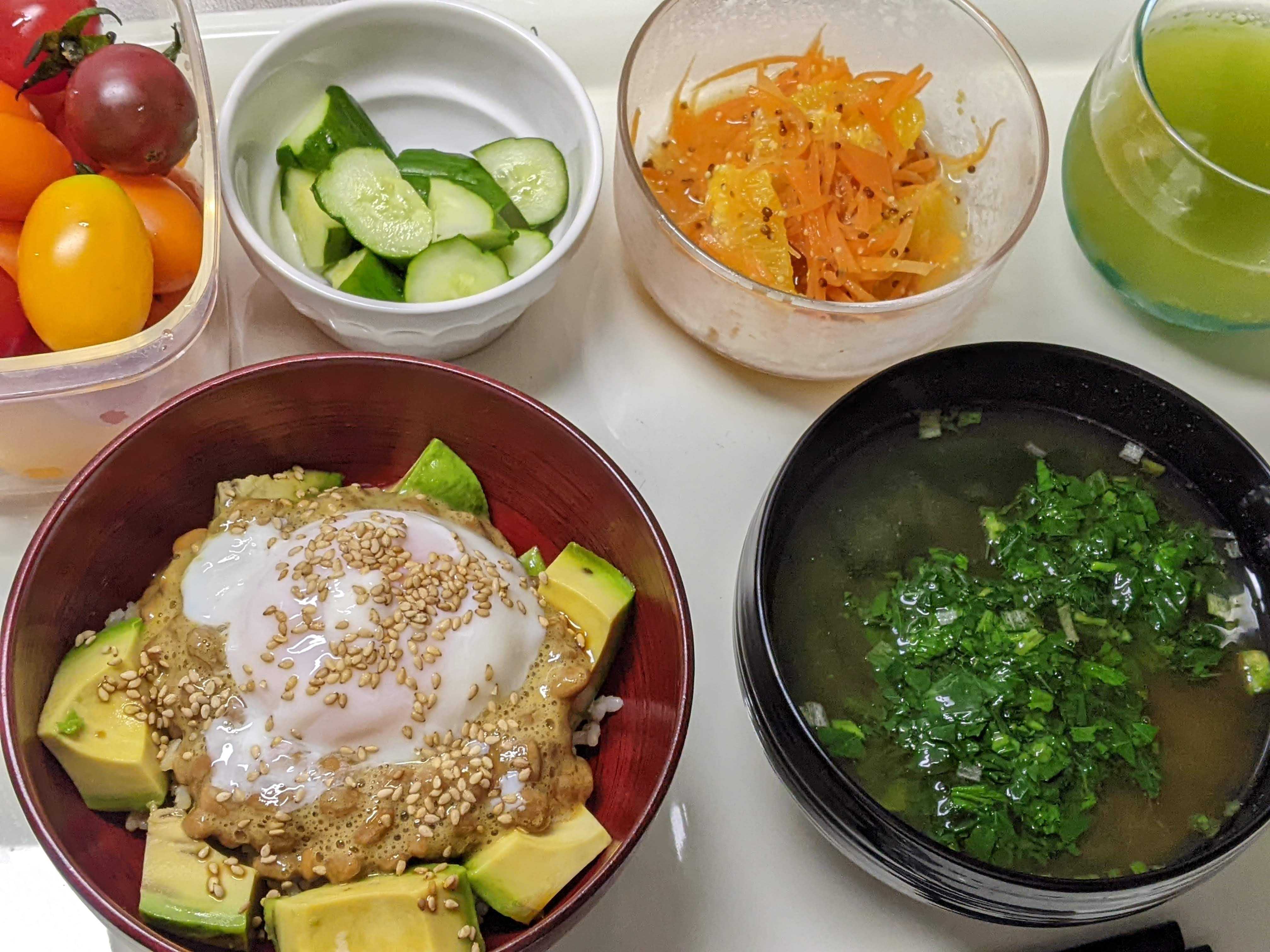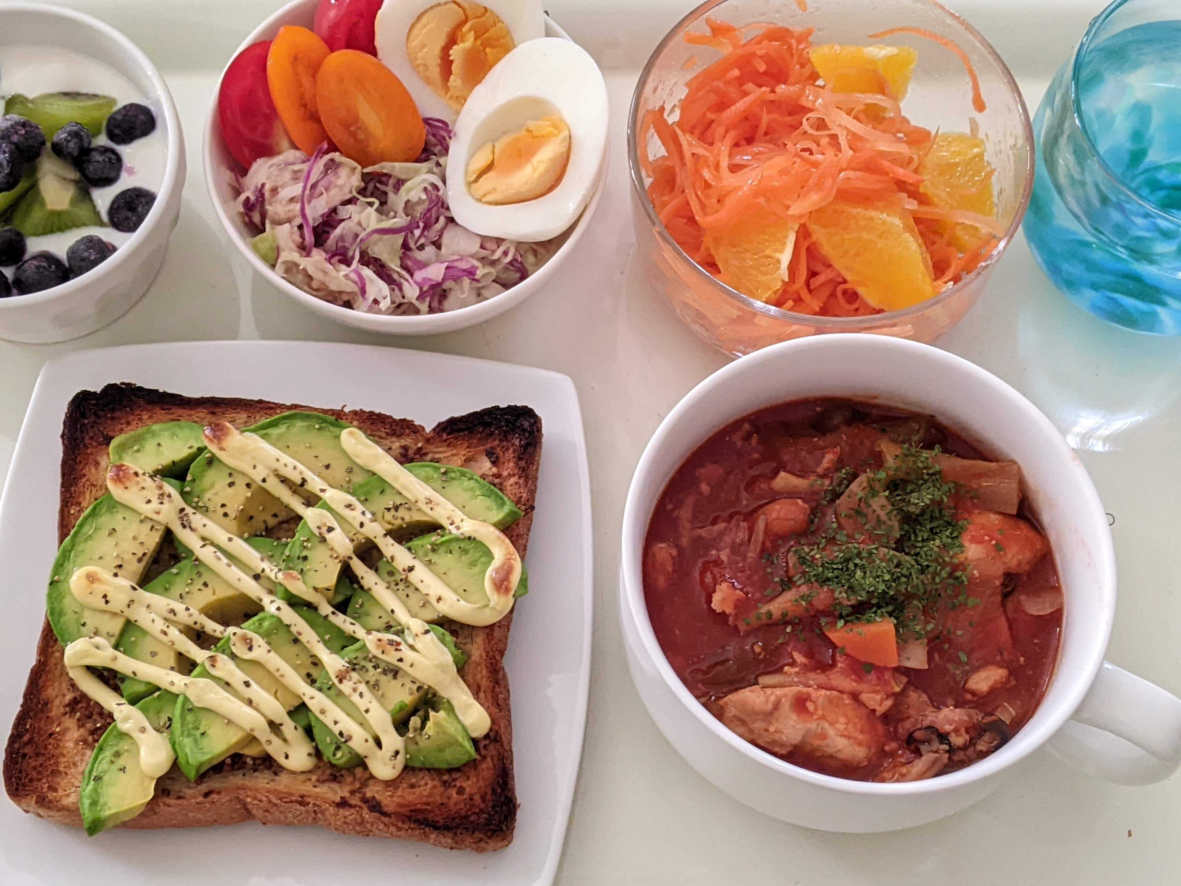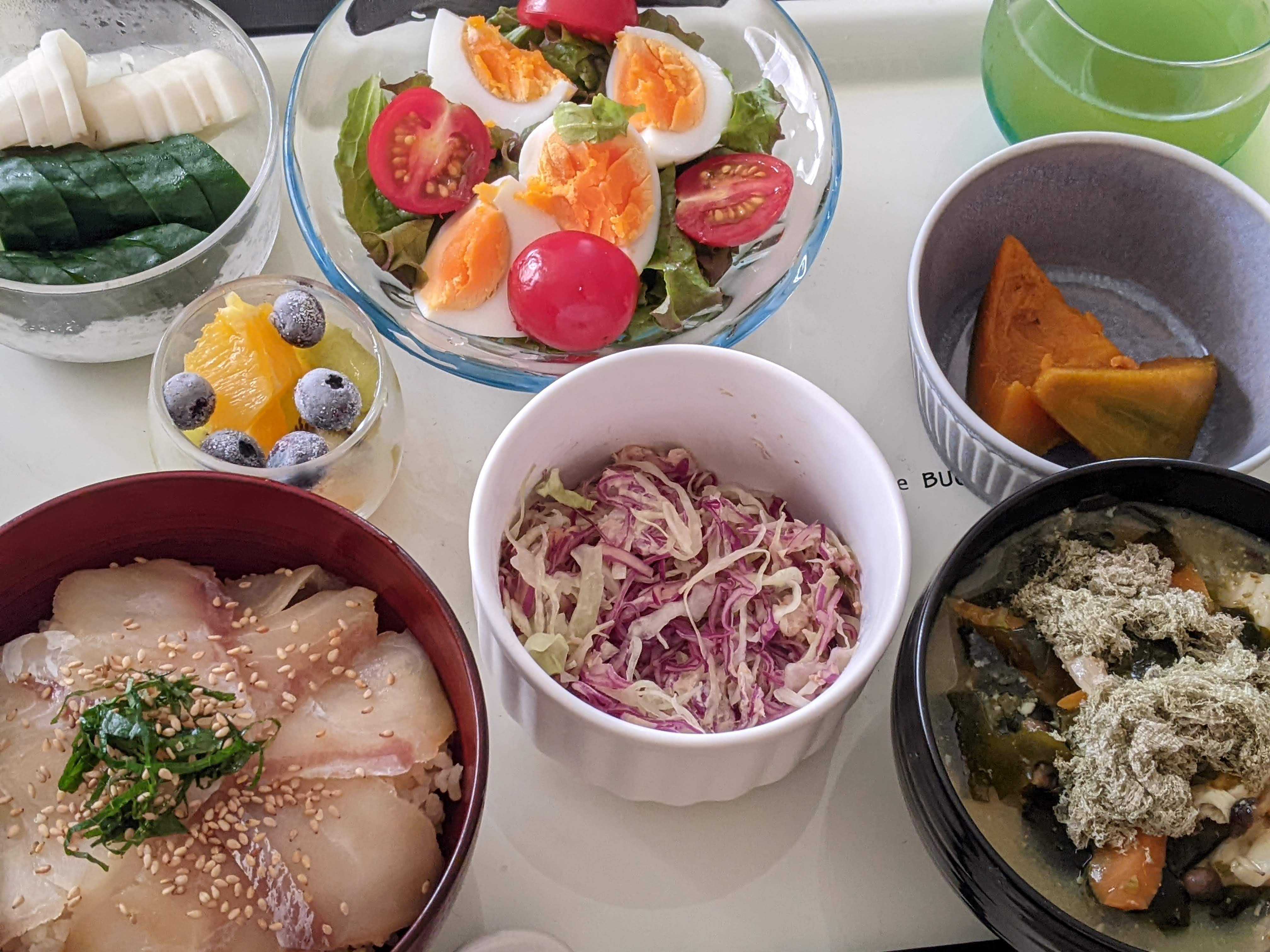 って感じだけど、付き合いの外食は仕方がない。きっと太っているんだろうなー、と思いながらの計測。思っていたほどではなかった。あー、多分明日くるかな?(笑)そんな本日の朝ごはん。はい、得意の冷や汁ごはんー<朝ごはん>・冷や汁 300g・玄米ごはん 100g睡眠不足で調子悪いので寝る。まぁまぁ寝れた!でももっと寝たい気分だったのでゴロゴロ。しかし目が覚めると眠れない。そんなこんなでお昼になったので起きてお昼にする。朝ごはんみたいな昼食(笑)パンが残っているから食べないと。<お昼ごはん>・アボカドトースト・サラダ・豆乳ポタージュスープ(粉末スープを少しのお湯で溶かしたら豆乳を入れるだけ)・巨峰 50gもうだらけスイッチが入ってしまい、今日は出かけないことに(笑)少し睡魔がきたので昼寝をする。夕方起きて夕飯の支度。昨日蒸し料理の話題が出たので私もやってみる。というか、木曜日に買ったブロッコリーの存在を忘れていたことに気づいたのもある。それにしてもこのお鍋、使うのいつぶりだろ?(笑)他にあった野菜もどーーーん!あ。タンパク質!ってところで冷凍庫にあった豚肉を投入!解凍しきれてなくて剝がれなかったのでそのままどん!10分蒸す。その間、食べて寝てだけの1日に少し罪悪感を抱いたので腕立て伏せを15回やってみる。それとちょっとしたストレッチ。気休め程度だけど(笑)そうしているうちに10分経ったのでごはんにする。<晩ごはん>・蒸し野菜と豚肉100g・キュウリの糠漬け・大根の梅酢漬け・豆乳ヨーグルト60g、バナナ55g、ブルーベリー10g殆ど寝てばかりの1日。たまにはこんな日もいいじゃん?(笑)ゆっくり身体を休めた感があっていい。明日は・・・絶対増量しているな(笑)
