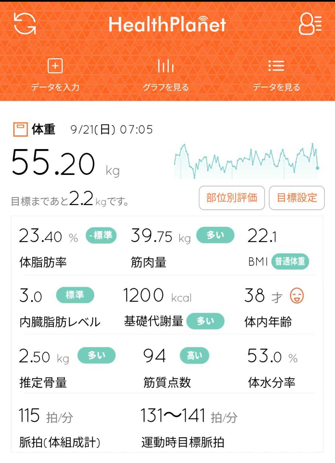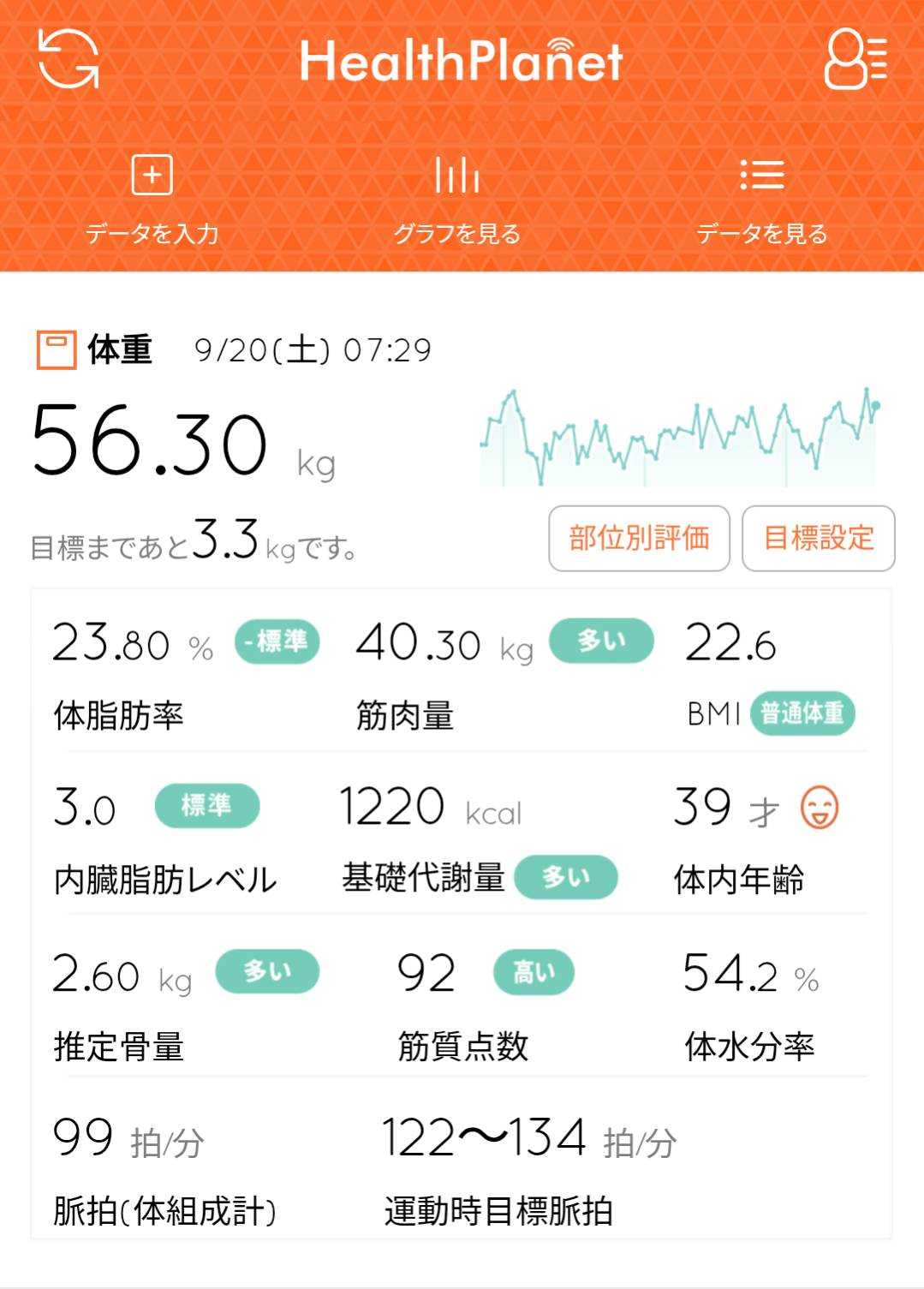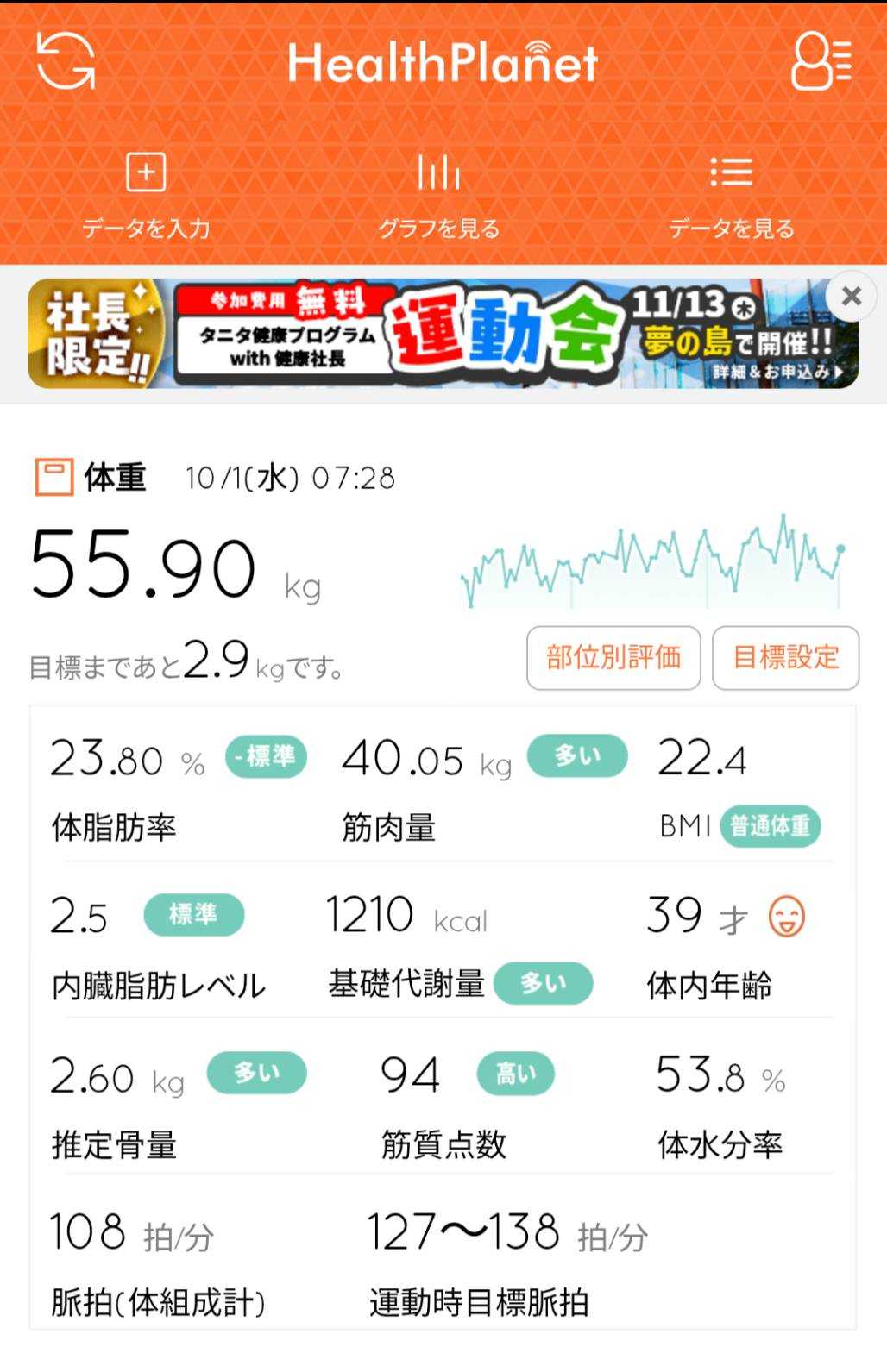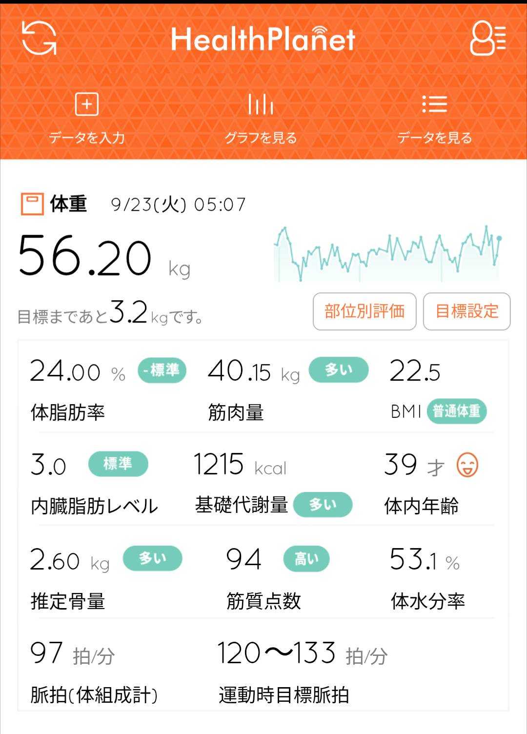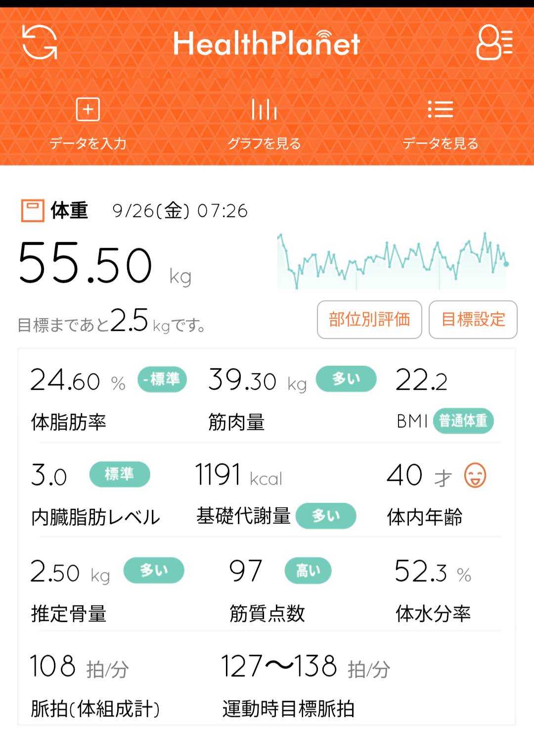 右耳の違和感と不眠は解消されてはいないけど、それなりに改善はされたのでひとまず記録は終了。(ちなみに昨夜は4時半まで眠れなかった・苦笑)夏の間、少しずつ少しずつ大きくなってきたこのカラダ。ここへきて追い打ちをかけて急激に増量してしまったので意を決してダイエットスタート!まずは現状の把握から。あ、少し減ってた!(昨夜ヨーグルトだけだったしね)とは言っても下っ腹は出ているし、顔も二重アゴになっているし。明らかに増量しているから(苦笑)なのでこれから54キロ前半を目指す!<朝ごはん>・味噌汁(昨日の残り)モロヘイヤ、とろろ昆布のせ・玄米ご飯 80g・納豆 40g・温泉卵 54g・筍と椎茸の佃煮 ※お土産で貰った・大根と人参の糠漬け・大根の梅酢漬け ※実家からのいただきもの・オレンジ40g 、ブルーベリー15g<お昼ごはん>・味噌汁(インスタント)・ごはん 120g(多分)・トンテキ 150g(多分)・レタス、ミニトマト、・ぶどう 20g<晩ごはん>・オートミール 40g・豆乳 180g・カッテージチーズ 20g・粉チーズ 5g・治一郎のバウムクーヘンカット 2切れ今夜はジムに行くので比較的1日しっかりめの食事。事前にタンパク質20gと糖質50gは摂るように言われているのでこんな感じか?と思ったら糖質少なめだったので治一郎のバウムクーヘンカットを追加。でもちょっと50gには足りず45g。ま、これくらいならいいでしょう?運動中、ポカリ飲むし。そして明日からはこの呪文を唱える!(笑)食べなきゃ痩せる 食べなきゃ痩せる 食べなきゃ痩せる(自己暗示にかける的な?)あ!でも難聴ではないとはいえ、耳の調子はイマイチなんだよなー今回上記の呪文を唱えるのはちょっと難しいかな?悪化したら嫌だし。『食べなきゃ痩せる』ではなく『多少食べても痩せる』な感じで。まぁ、いろいろやってみよう!ということでジム行ってくる!寝不足だからどうかなぁ???早めに帰ってすぐ寝よう!