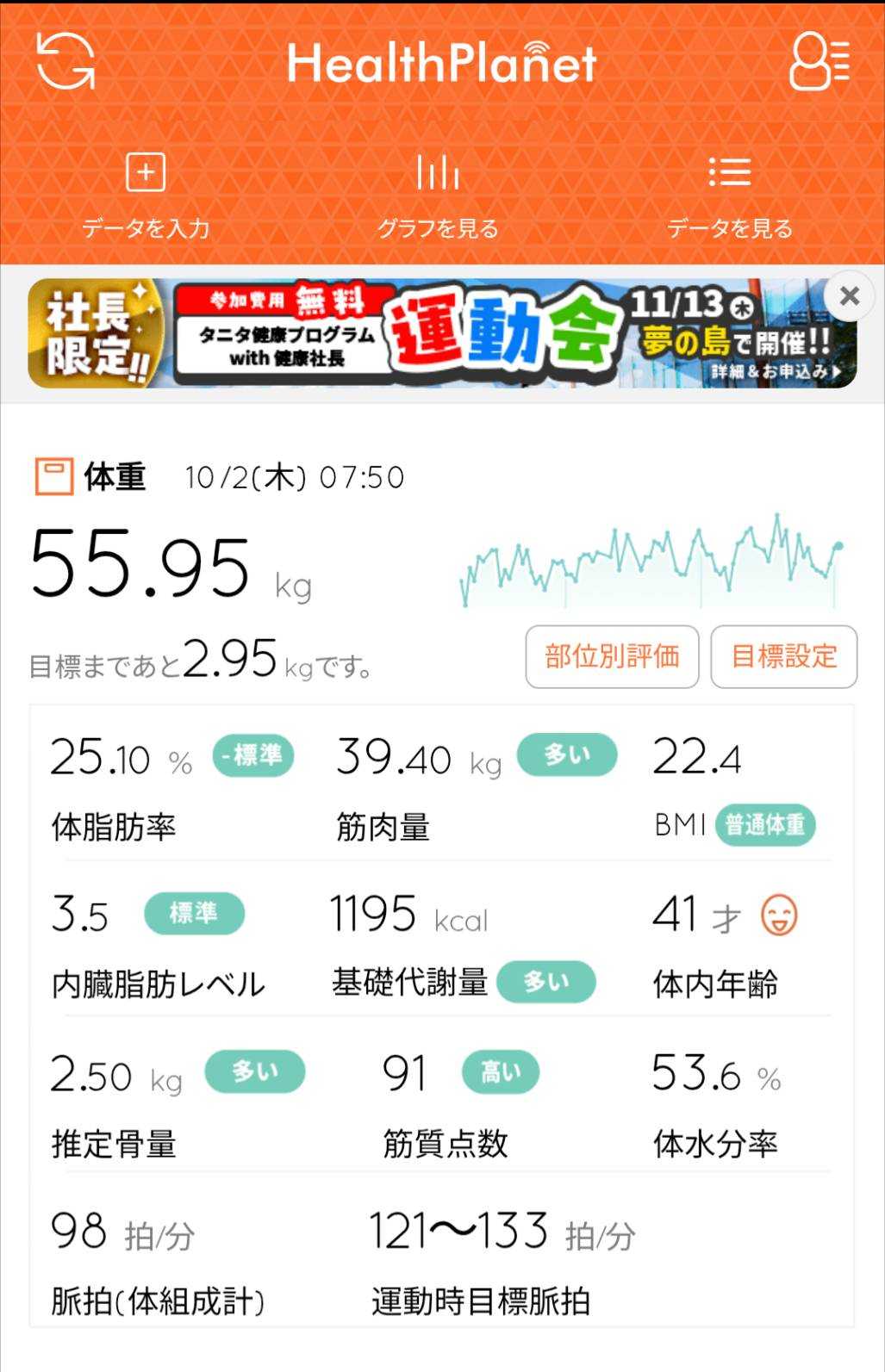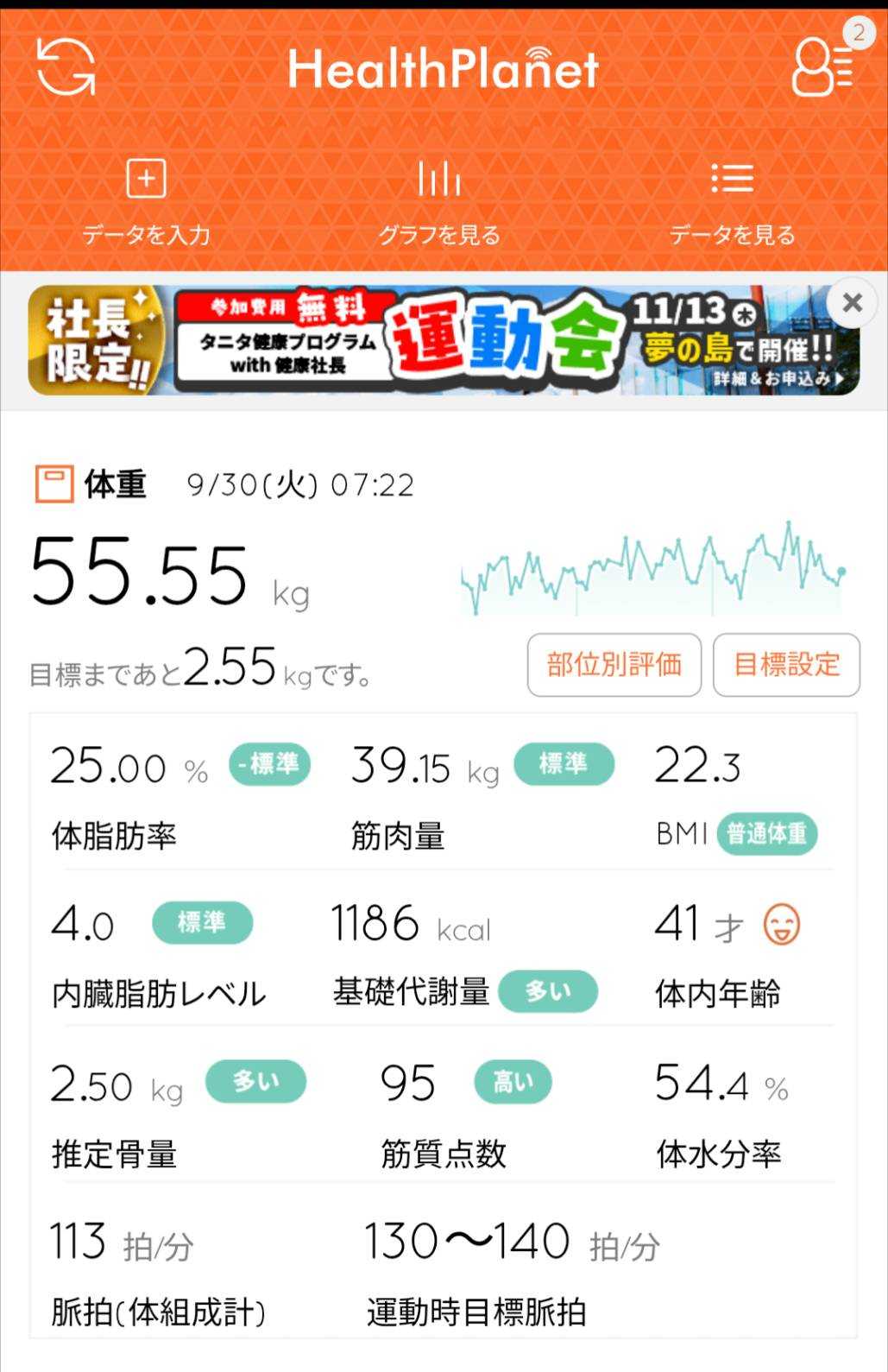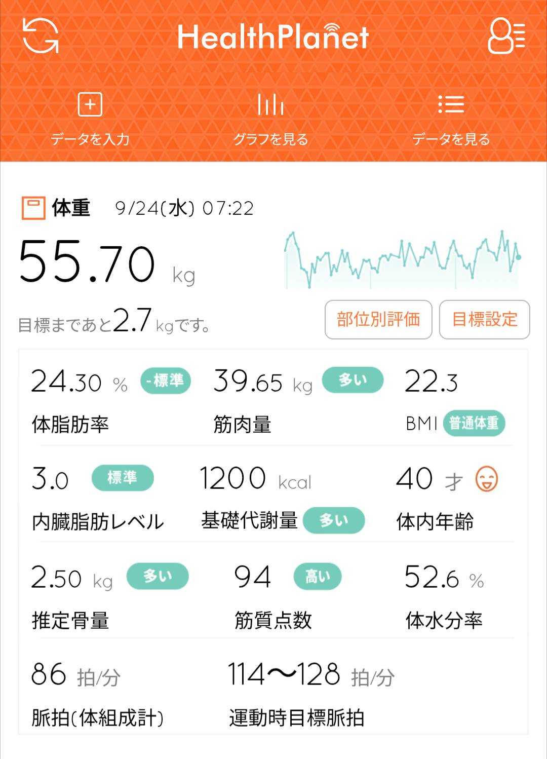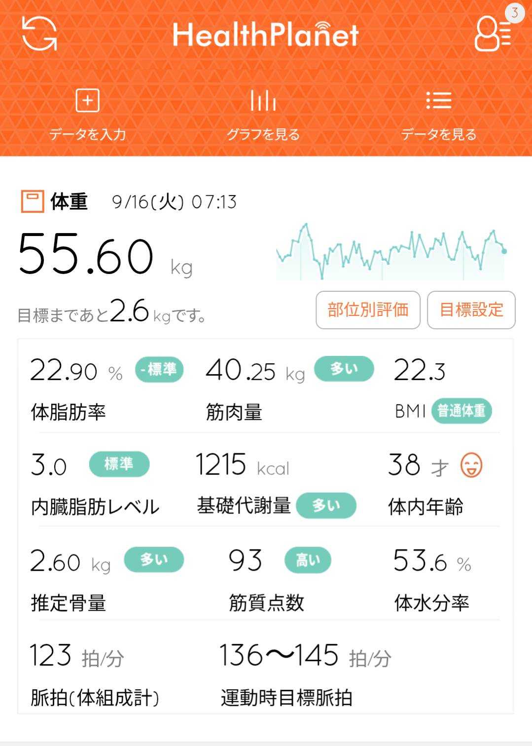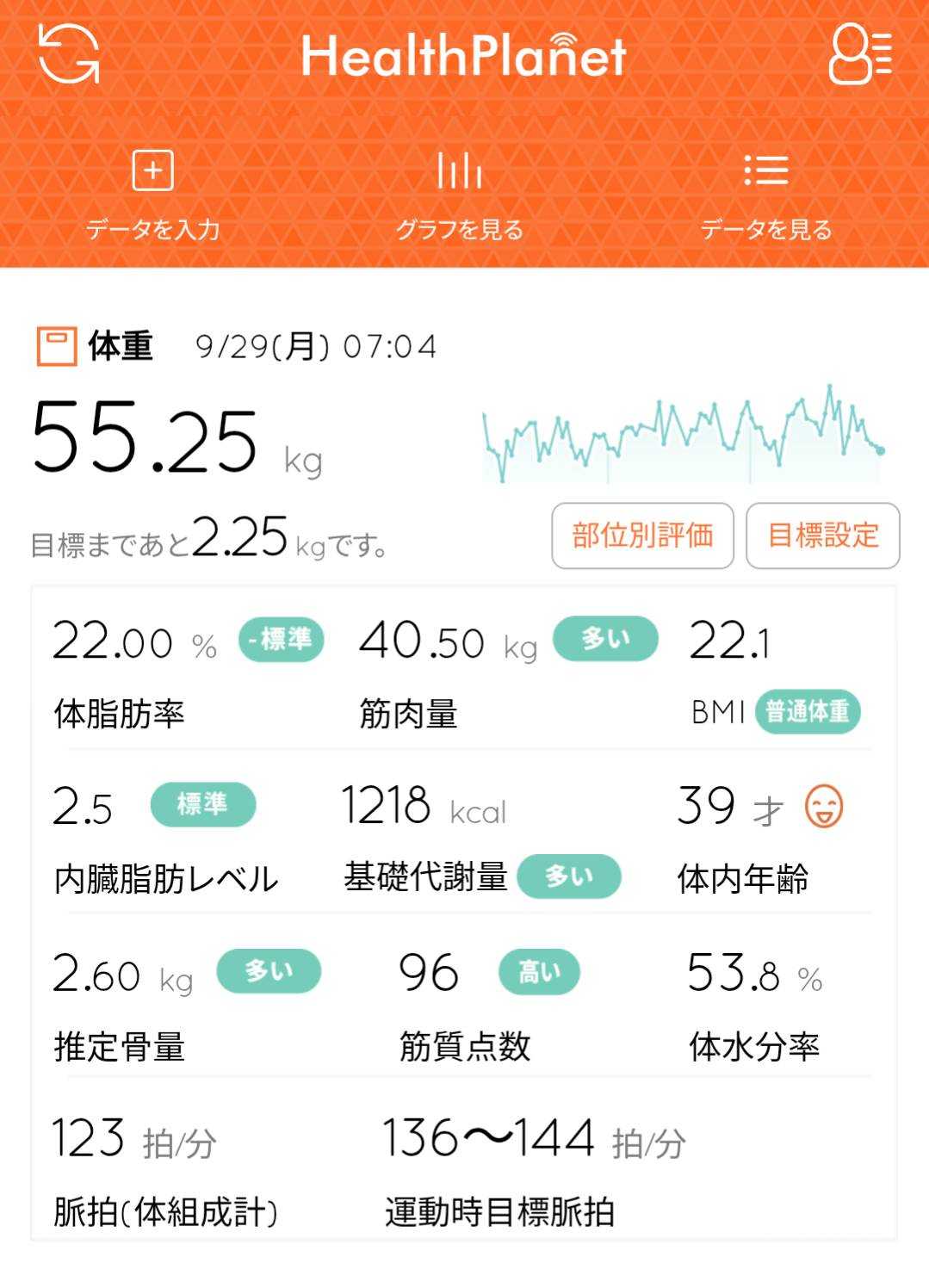 右耳の違和感と不眠は解消されてはいないけど、それなりに改善はされたのでひとまず記録は終了。(ちなみに昨夜は4時半まで眠れなかった・苦笑)夏の間、少しずつ少しずつ大きくなってきたこのカラダ。ここへきて追い打ちをかけて急激に増量してしまったので意を決してダイエットスタート!まずは現状の把握から。あ、少し減ってた!(昨夜ヨーグルトだけだったしね)とは言っても下っ腹は出ているし、顔も二重アゴになっているし。明らかに増量しているから(苦笑)なのでこれから54キロ前半を目指す!<朝ごはん>・味噌汁(昨日の残り)モロヘイヤ、とろろ昆布のせ・玄米ご飯 80g・納豆 40g・温泉卵 54g・筍と椎茸の佃煮 ※お土産で貰った・大根と人参の糠漬け・大根の梅酢漬け ※実家からのいただきもの・オレンジ40g 、ブルーベリー15g<お昼ごはん>・味噌汁(インスタント)・ごはん 120g(多分)・トンテキ 150g(多分)・レタス、ミニトマト、・ぶどう 20g<晩ごはん>・オートミール 40g・豆乳 180g・カッテージチーズ 20g・粉チーズ 5g・治一郎のバウムクーヘンカット 2切れ今夜はジムに行くので比較的1日しっかりめの食事。事前にタンパク質20gと糖質50gは摂るように言われているのでこんな感じか?と思ったら糖質少なめだったので治一郎のバウムクーヘンカットを追加。でもちょっと50gには足りず45g。ま、これくらいならいいでしょう?運動中、ポカリ飲むし。そして明日からはこの呪文を唱える!(笑)食べなきゃ痩せる 食べなきゃ痩せる 食べなきゃ痩せる(自己暗示にかける的な?)あ!でも難聴ではないとはいえ、耳の調子はイマイチなんだよなー今回上記の呪文を唱えるのはちょっと難しいかな?悪化したら嫌だし。『食べなきゃ痩せる』ではなく『多少食べても痩せる』な感じで。まぁ、いろいろやってみよう!ということでジム行ってくる!寝不足だからどうかなぁ???早めに帰ってすぐ寝よう!