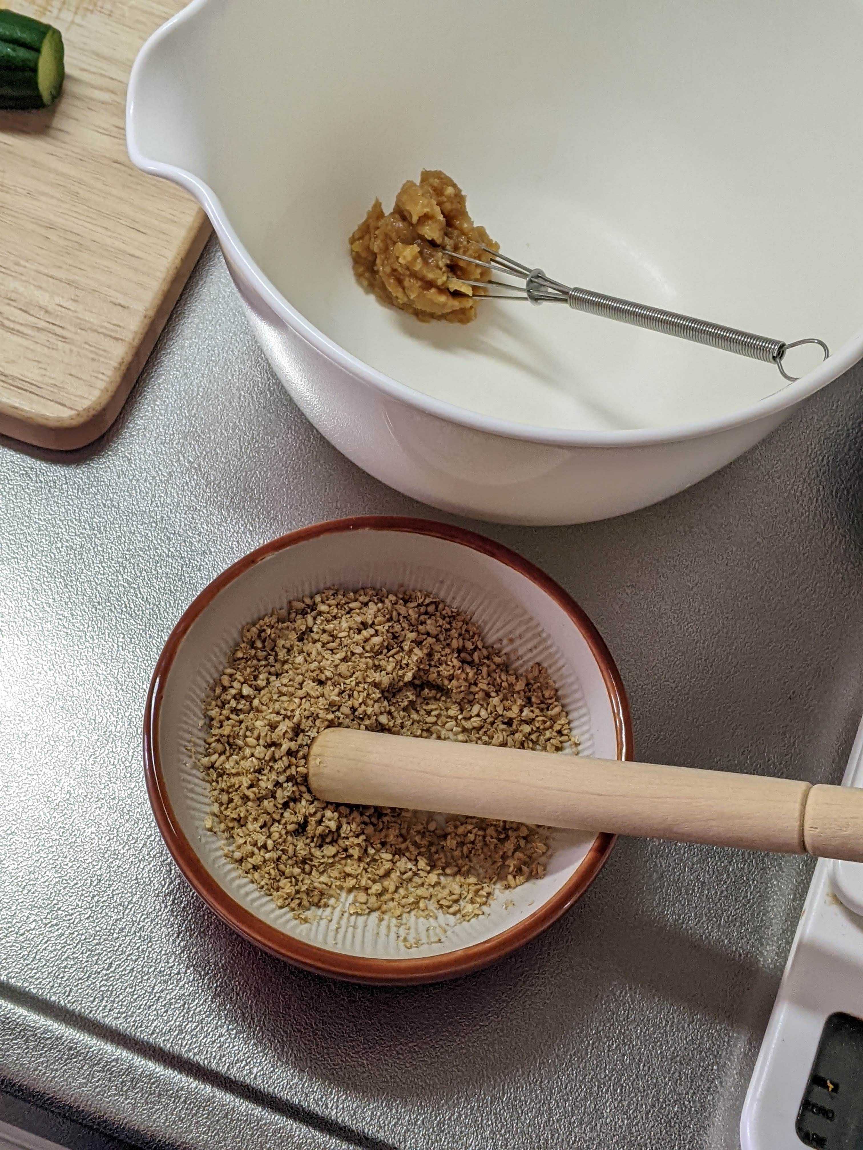 昨夜、最後に時計を見たのは3時半だった。7時に起きたので睡眠時間は多く見積もっても3時間半。・・・足りない。足りないーーーーーーー!起きてみると右耳は相変わらずイマイチ。しかも睡眠不足だからだろうね、心臓のあたりが変な感じ。今日は朝一で自転車屋さんに行ってみようかと思っていたんだけど予定変更。朝食食べたら寝る!温泉玉子作ったけど、納豆ごはんの気分ではなく(あー、調子悪いんだな)食欲もイマイチだけど薬を飲むには食事をとらないと。でもって難聴によさげな食事を。ってことで・・・冷や汁を作ってみる。青魚がいいらしいし。青魚と聞くと真っ先に出てくるのが鯖缶なワタシ。この胡麻を擦っている時の香りが好き。できた!これなら食欲がなくてもごはんが喉を通る。薬を飲んだら胃にはよくないかも?だけど寝る!今の私にとって睡眠時間の確保が最優先。身体を労わろう!眠れなくてもいいから横になっていよう!