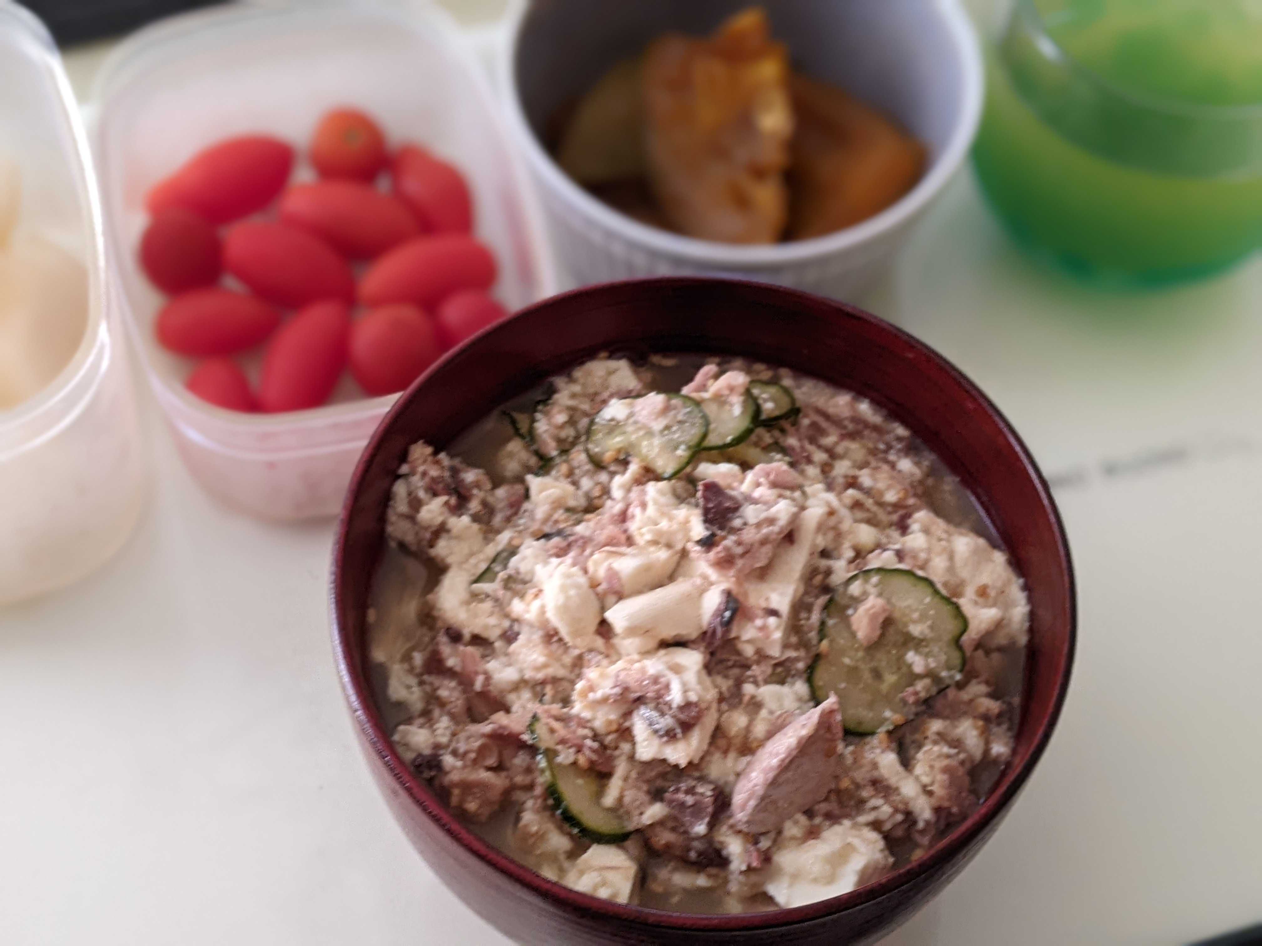 昨夜は帰りが遅かったのですぐ就寝。睡眠時間は1時~5時半。すぐ入眠出来た割には眠れていない。右耳の調子はイマイチ。薬も無いし、今日は病院が休みだから明日行ってこよう。今朝の計測結果。おぅ!増量してる!(笑)体脂肪増量は多分アレかな?月曜日のヌン活かな??結構食べたのって翌々日あたりに出る気がするんだよなー。あ、それともアレかな?ジムでアイス食べたから???ま、まだスタートしたばかりだし。焦らずいこう!<朝ごはん>・冷や汁 300g・玄米ごはん 100g・大根、人参の糠漬け・オレンジ25g、ブルーベリー15g胡瓜が無かったので大根と人参の糠漬け入れた。これもアリ。でも胡瓜が欲しいなー、今日買い物行くから買ってこよう。やっぱり糠漬けは胡瓜が一番好き。ミニトマトや固めのアボカドも意外と美味しい。<お昼ごはん>・野菜の味噌汁・ごはん 多分120g・肉野菜の炒め物・マカロニサラダ・ぶどう昨日トレーナーさんにもらったカップラーメン(笑)カップラーメンなんていつぶりだろ?昨夜いただくつもりだったけど、珍しく睡魔があったので食べ損ねた。なので帰宅が遅くなった今夜いただくことに。<晩ごはん>・麺づくり・ゆで卵(なんか爆発してた・笑)・大根の梅酢漬けラーメン食べたら睡魔が。これはすぐ眠れるかも???早く寝よう!ということでおやすみなさい。このまますぐ入眠出来るといいなぁ。