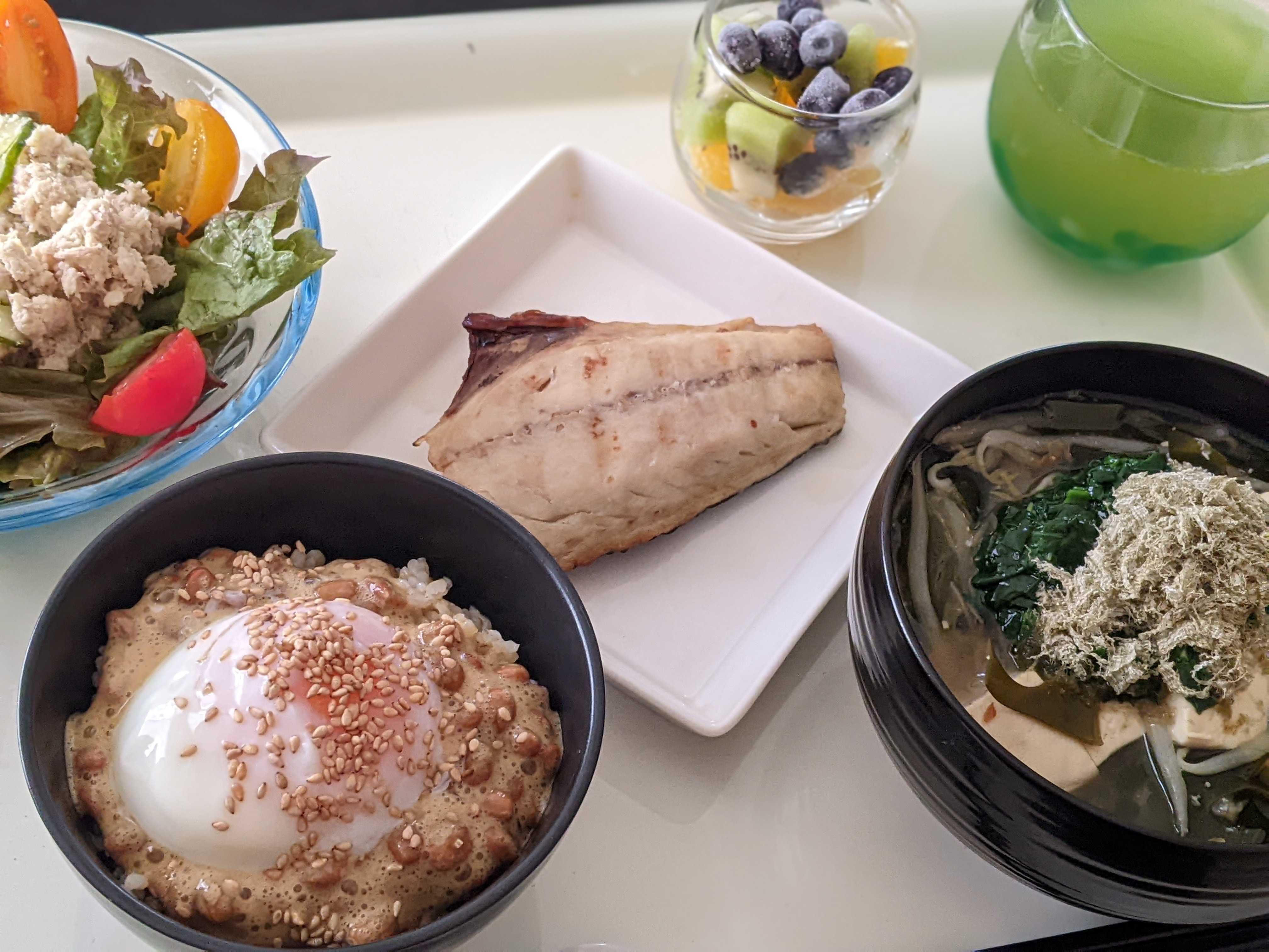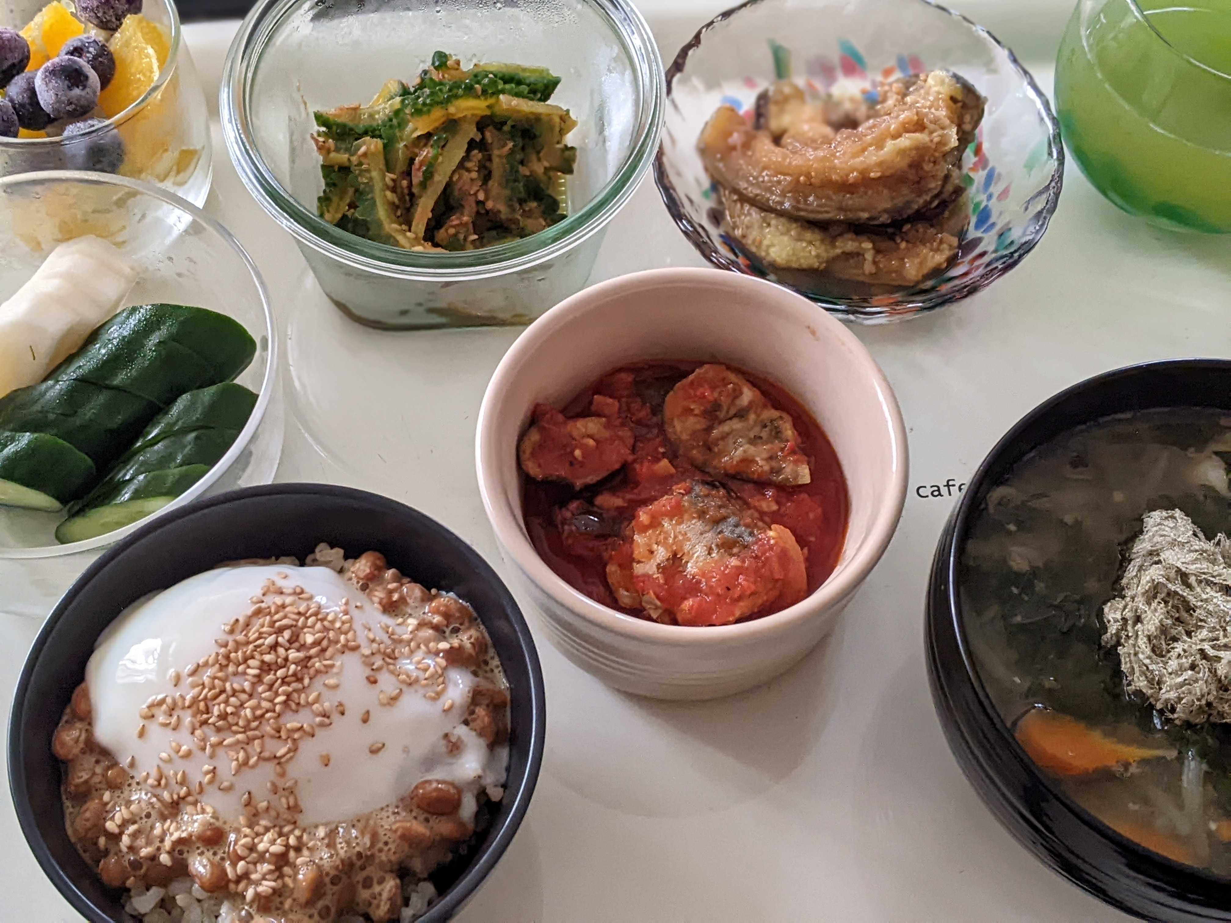 眠ることがこんなに大変なことだなんて・・・昨夜の振り返り。23時 就寝(が、眠れず)3時 トイレへ(その後入眠したもよう)6時 目が覚める7時 起床うーん、ダメだったかーまぁ3時間でも眠れたからいっか。ってところで。でもダルかった。そして右耳の違和感は治っておらず(だろうね)あぁ、ここまでに治しておきたかった。調子が良い状態で3連休を迎えたかったな・・・そんな少し気怠い朝のごはん。<朝ごはん>・味噌汁(昨夜の残り)・納豆温玉のせごはん・茄子と鯖缶のトマト煮込み(昨夜ホットクックで作っておいた)・蒸し茄子のネギだく漬け・ゴーヤのおひたし・キュウリと大根の糠漬け・オレンジ、キウイ、ブルーベリー明日から3連休!早速明日は朝早くからお出かけの予定。ちゃんと眠れないと困るので仕事帰りにマッサージへ。お気に入りのヘッドスパ屋さんは予約取れなかった。残念。数年前に行ったことがあるお店へ。金額を考えると今日行ったお店の方が断然コスパ良し!満足度大だった!今夜眠れるようだったら・・・行く候補が増えるわね。期待しちゃう!そして帰宅が遅くなったので簡単ごはん。<晩ごはん>・冷奴(蒸し茄子のネギだく漬けのせ)・ゴーヤのおひたし、ミニトマト・キュウリと大根の糠漬け冷蔵庫の整理。作り置き系は全て食べておきたい。トマト煮もまだ残っているけど明日の朝だなーてか、食べている余裕あるのか???炊いたごはんも食べきりたいし、作ってある温玉も消費しておきたい。そしてまだ全然荷造りしていないからこれからやらなきゃ!いつも旅行前日になってバタバタするの、なんとかしなさいよ、ワタシ(苦笑)いつもの出社時間よりも1時間半ほど早い出発。少しも早く寝たいけどどーなることやら(苦笑)まぁ、電車移動だから最悪電車の中で寝よう!・・・友達もいるのに眠れるのかビミョーだけど。右耳の違和感はありまくりだけど明日が楽しみ!