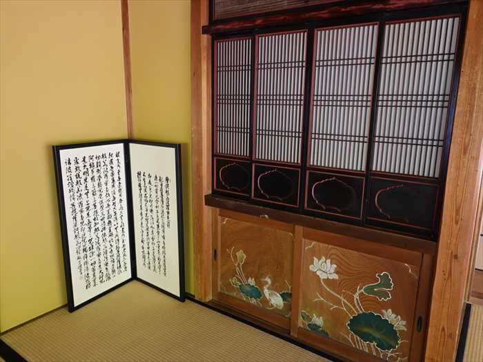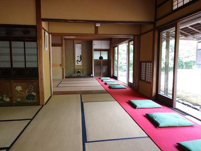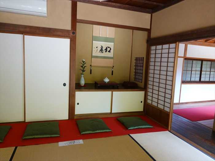 書院にも緋色の毛氈が敷かれ観賞用の座布団が。