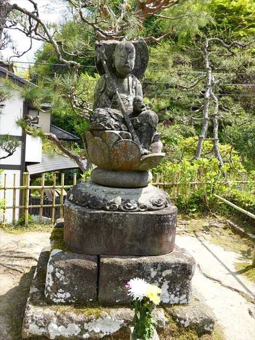 山門左の、蓮の上に乗った地蔵様の像、目がつり上がってユーモアも。