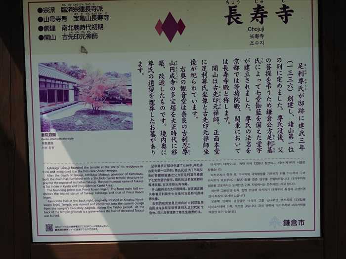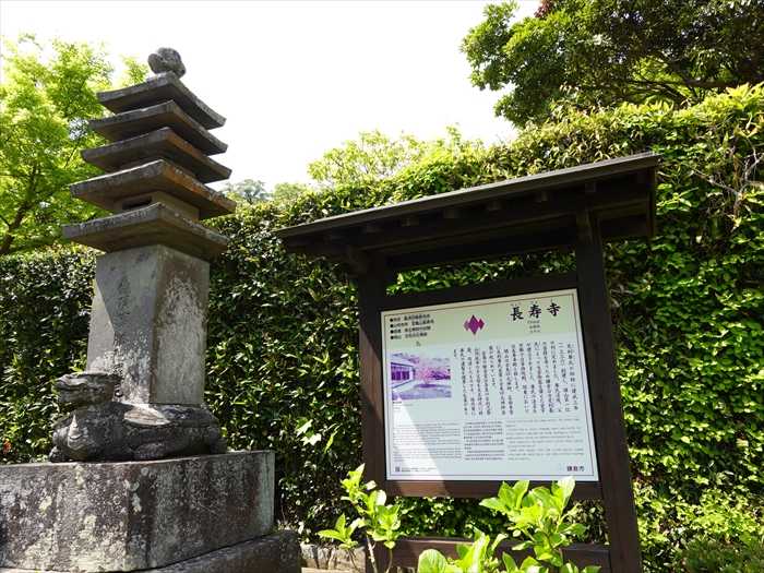 晩年はここ長寿寺に居住した。80歳で没し、墓は建長寺広徳庵・長寿寺曇芳庵にある。」