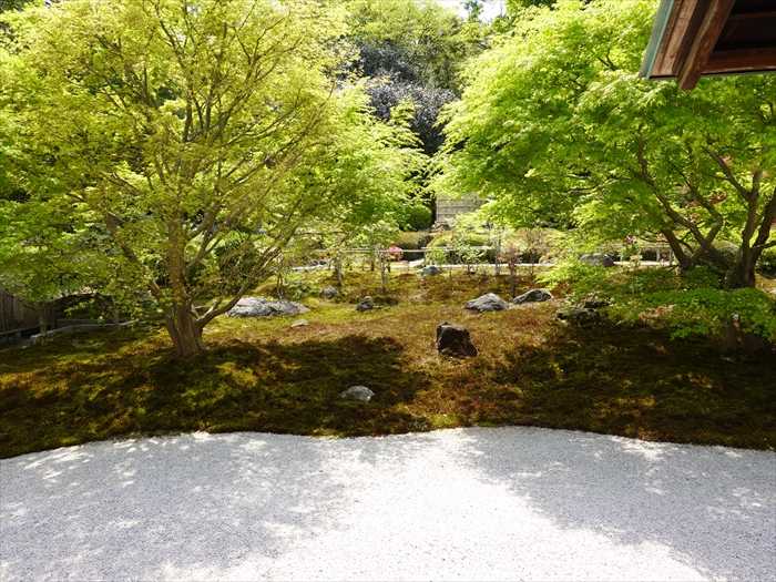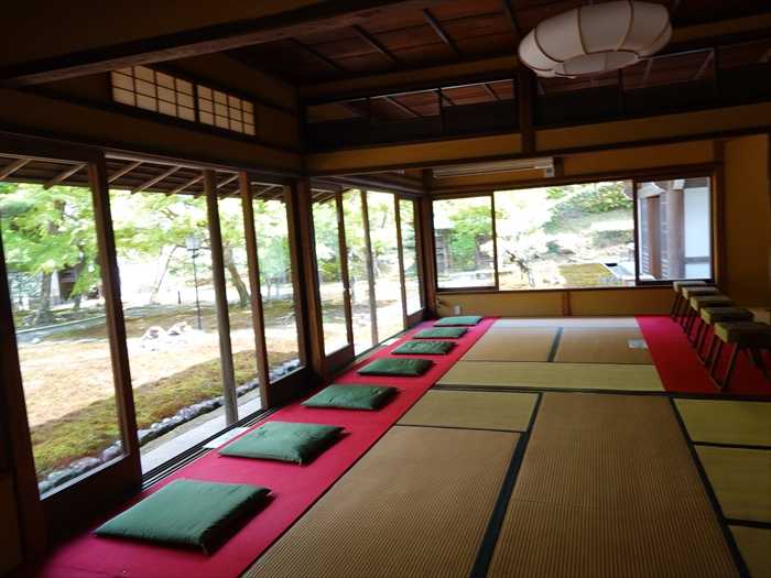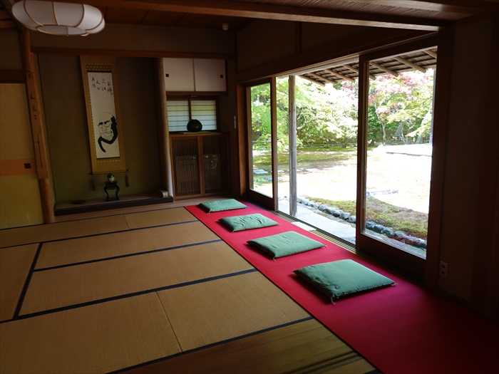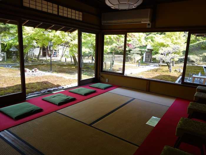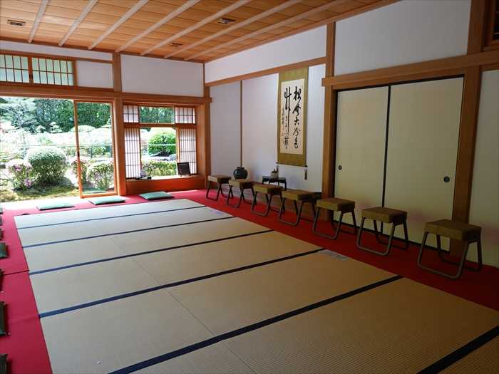 「小方丈」には緋色の毛氈が敷かれ、ご緩りお庭をご覧くださいと書いてあった。