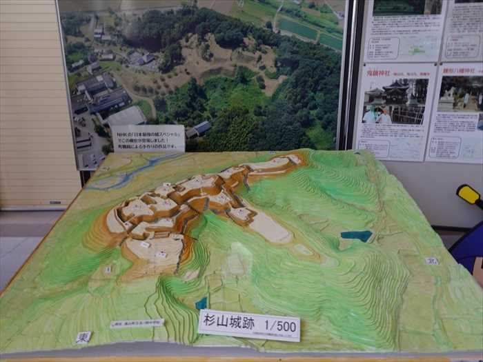 「杉山城跡 1/500」のジオラマとその裏側に案内パネル。