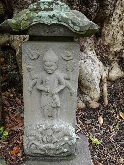 四手の青面金剛が邪鬼の上にたっている。右の上手には鉾、下手は矢をもち、左上手は棒、
