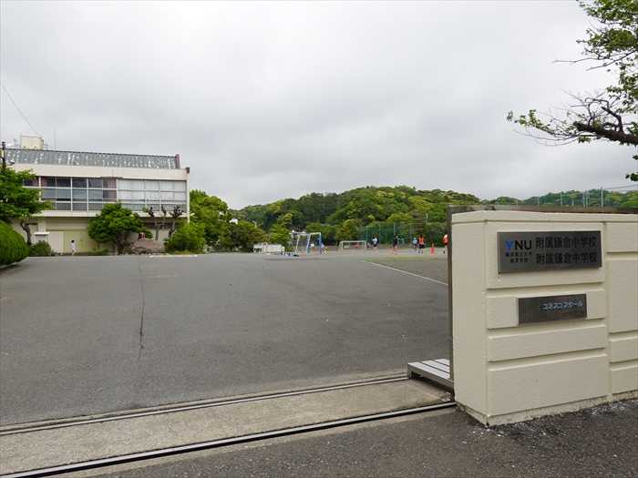 突き当りを左折し、「YNU 横浜国立大学 教育学部 附属鎌倉小・中学校」の校庭の