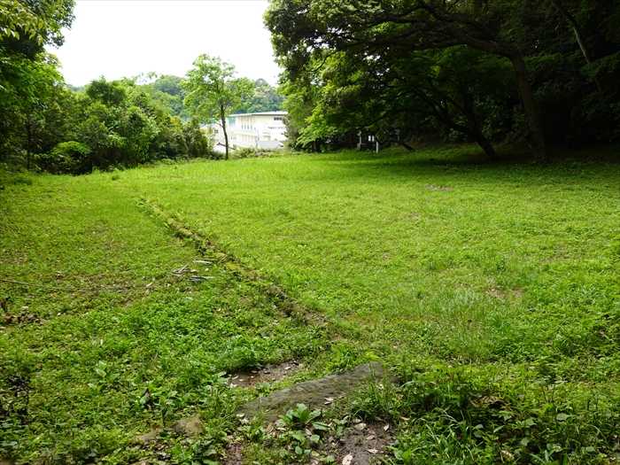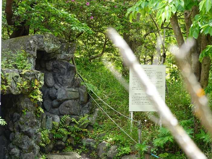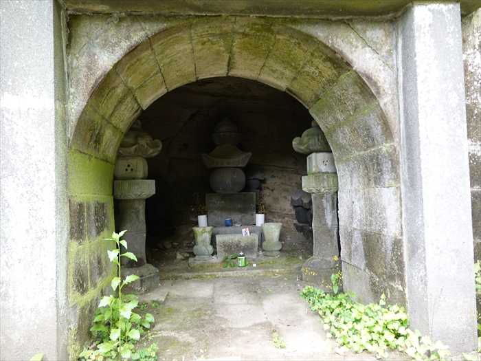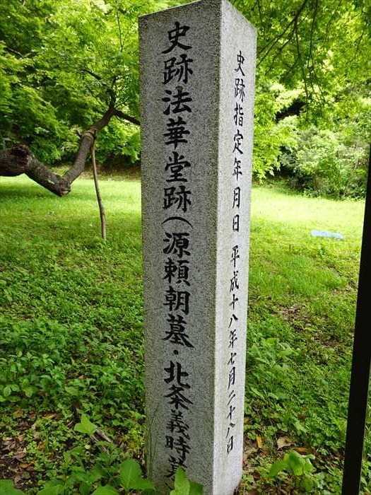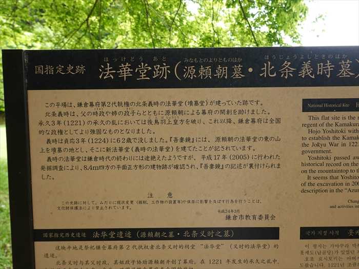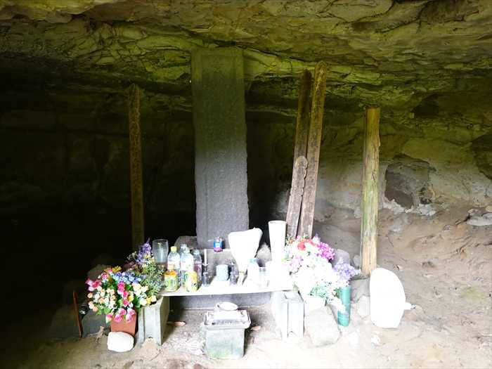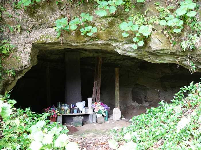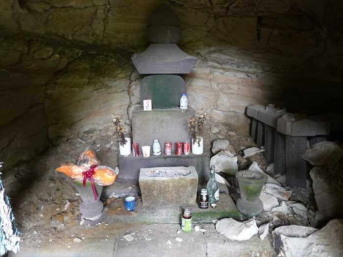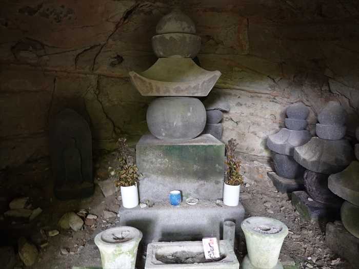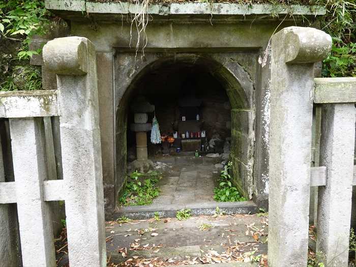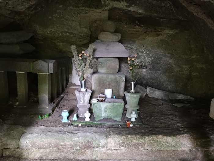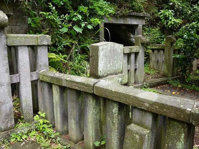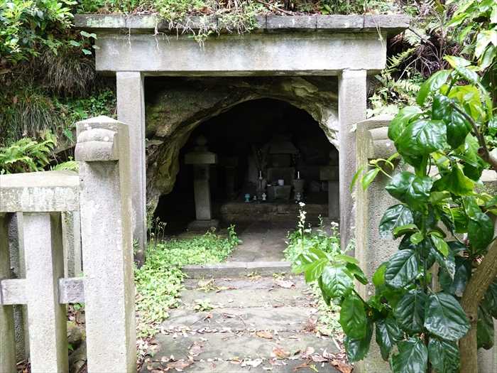 法華堂跡の奥の山肌、石鳥居の手前には「三浦泰村一族の墓」と伝わる「やぐら」があった。