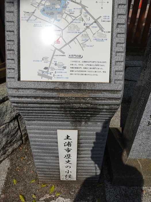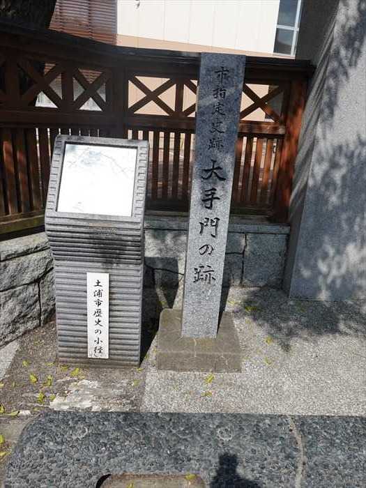 「市指定史跡 大手門の跡」碑と「土浦市歴史の小径」碑。