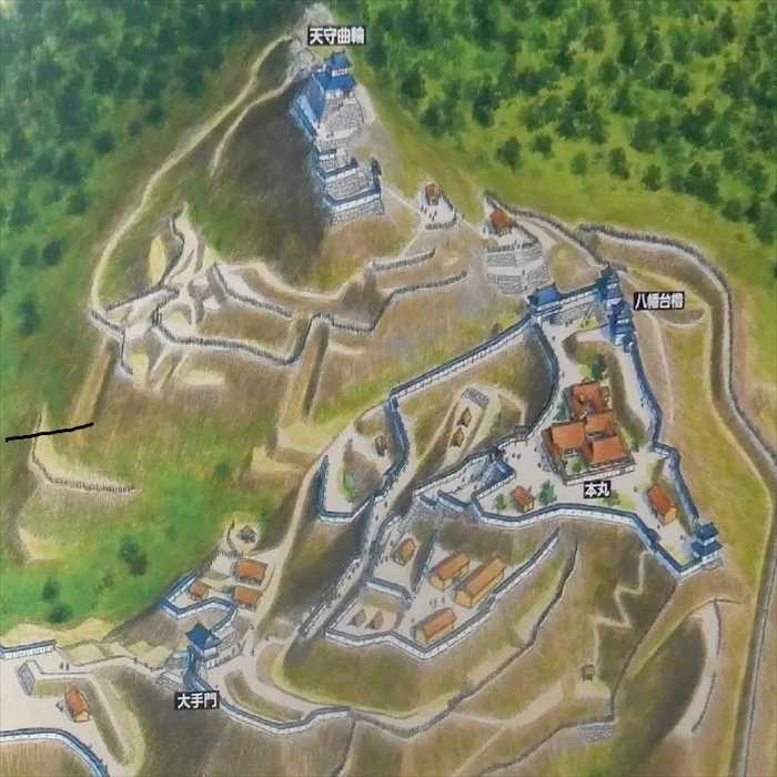 「三の曲輪」「二の曲輪」「帯曲輪」「殿守曲輪」を設け、曲輪には白壁の塀をまわし、