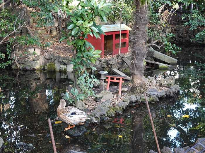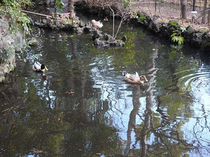「弁天池」の縁には鳥用の檻も設置されていて、鯉や蟹などと混じって羽を休めている