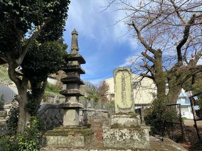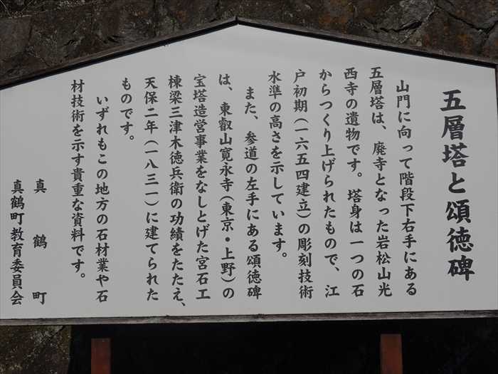 山門に向かって階段下右手にある五層塔は、廃寺となった岩松山光西寺の遺物です。