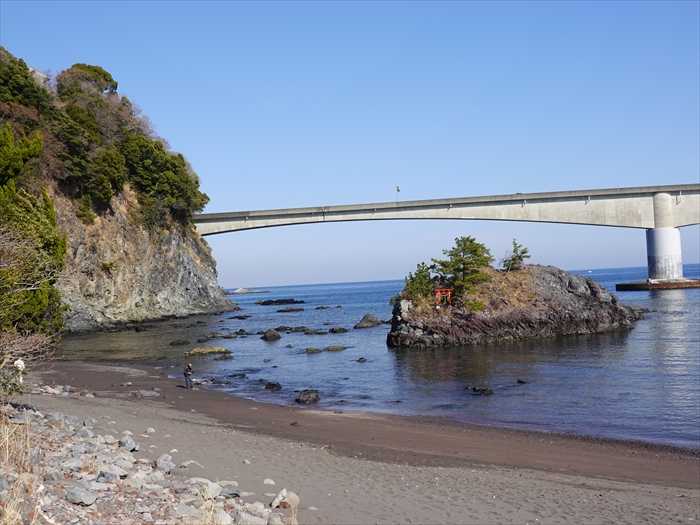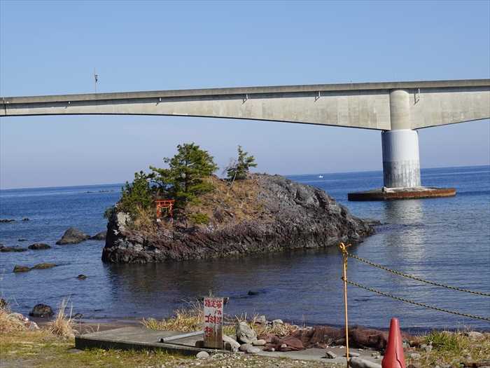 波間に浮かぶ岩に聳える松と鳥居があり、背後にはかながわの橋100選に選ばれた岩大橋がある。