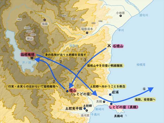 石橋山の戦い後の源頼朝の敗走ルートをネットから。