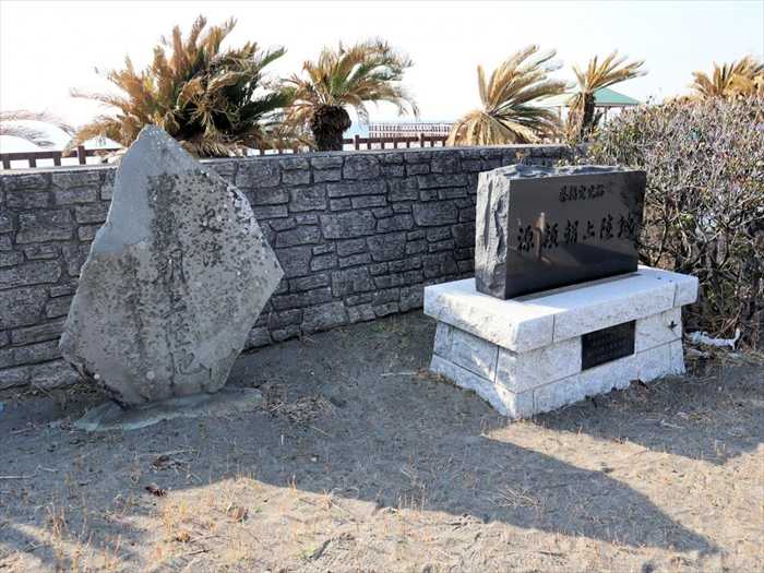 「源頼朝船出の浜」碑が「源頼朝開帆處」碑と背中を合わせる位置にあった。