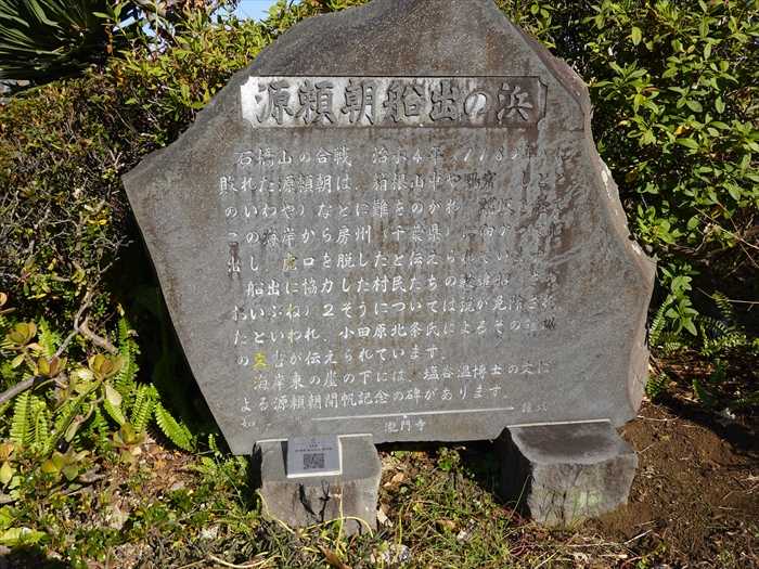 海岸東の崖の下には、塩谷温博士の文による源頼朝開帆記念の碑があります。」