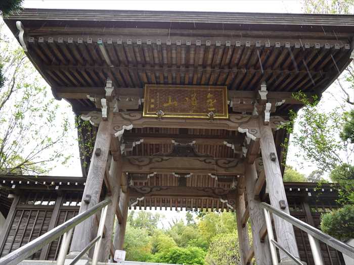 石段の上にある「山門」を正面に見る。