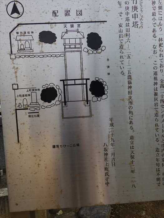 この庚申塔の造立は天保四年(一八三三)て安山岩で造られている。上町道祖神と共に