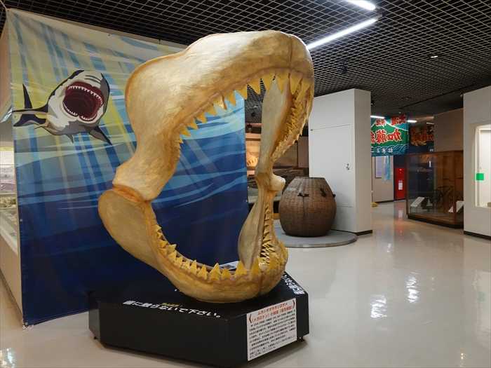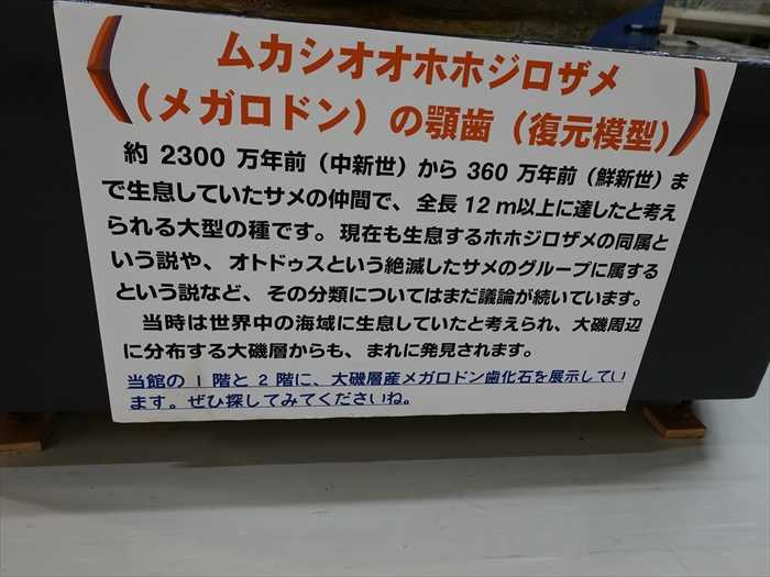 「ムカシオオホホジロザメ(メガロドン)の顎歯(復元模型」。