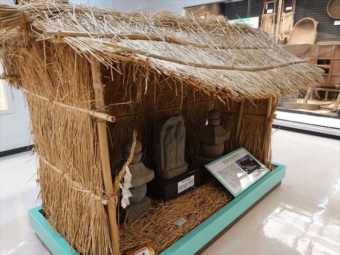 藁で作られた御仮屋の中に石仏そして五輪塔が。