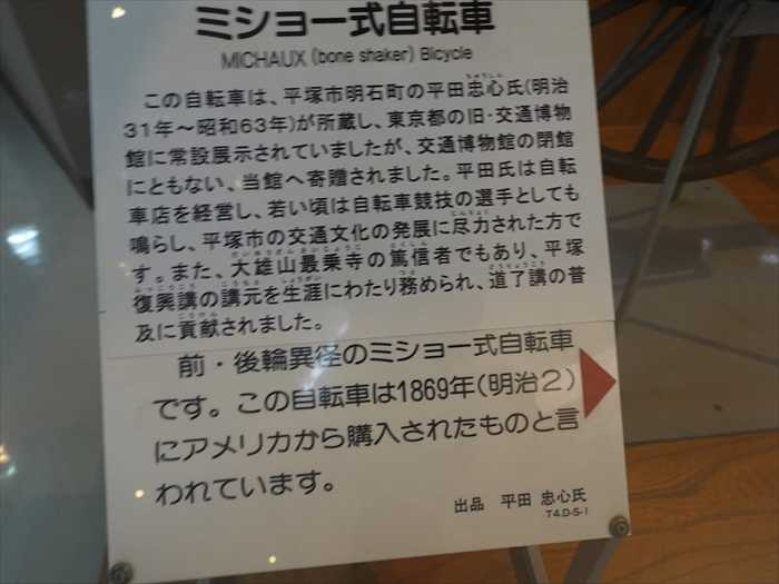 この自転車は、平塚市明石町の平田忠心氏(明治31年~昭和63年)が所蔵し、東京都の旧・