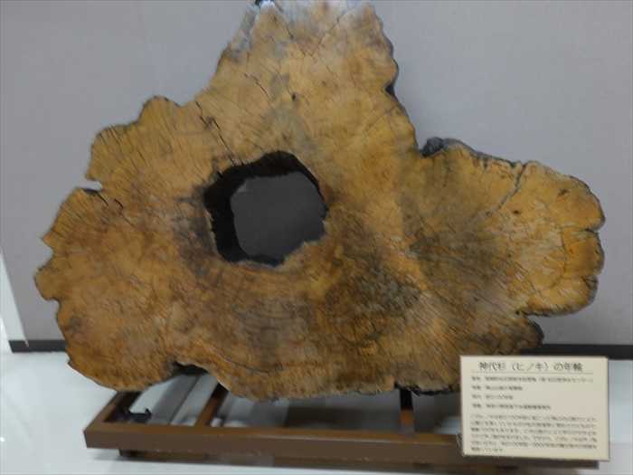 このヒノキは約3100年前に起こった神山の山崩れにより、山腹に生育していたものが