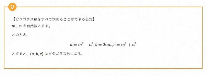 m と nに様々な値を代入するだけで、無限にピタゴラス数を作り出せるのです。