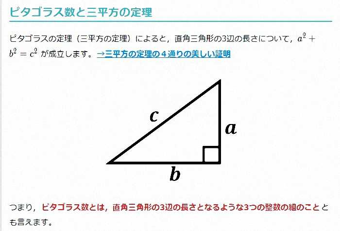 ピタゴラス数 】は、『 a^2 + b^2 = c^2 を成り立たせる3つの自然数 a  、  b  、 c の組 』である。