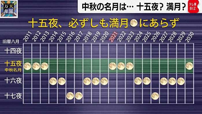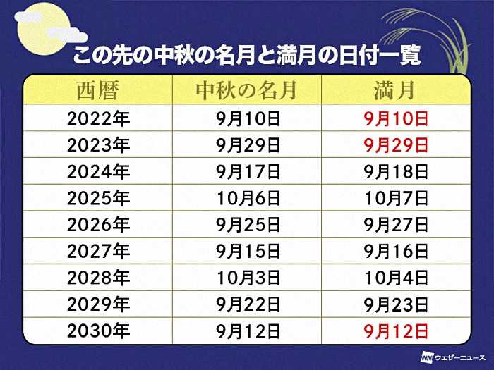 新月から満月までにかかる日数は13.9日から15.6日なっているので、年によっては中秋の名月の